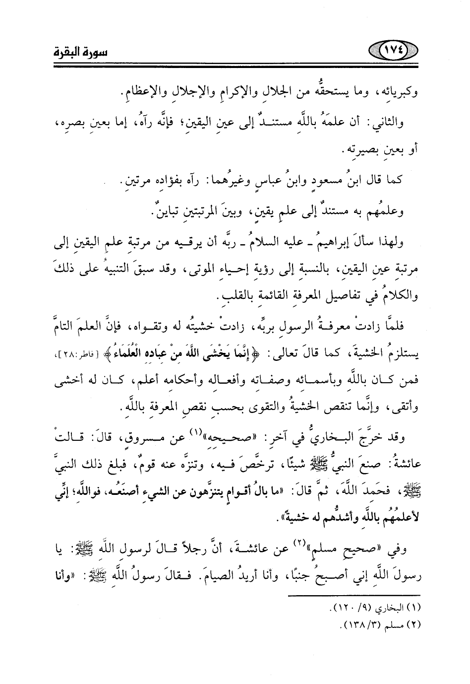 ولهذا سألَ إبراهيمُ - عليه السلامُ - ربَّه أن يرقيه من مرتبةِ علمِ اليقينِ إلى