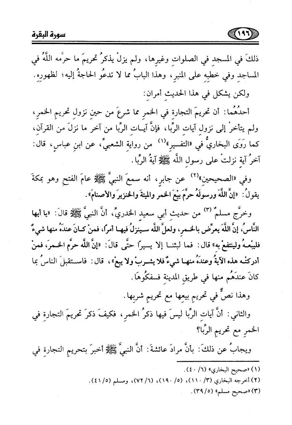 والثاني: أن آياتِ الربا ليسَ فيها ذكرُ الخمرِ، فكيفَ ذكرَ تحريمَ التجارةِ في
