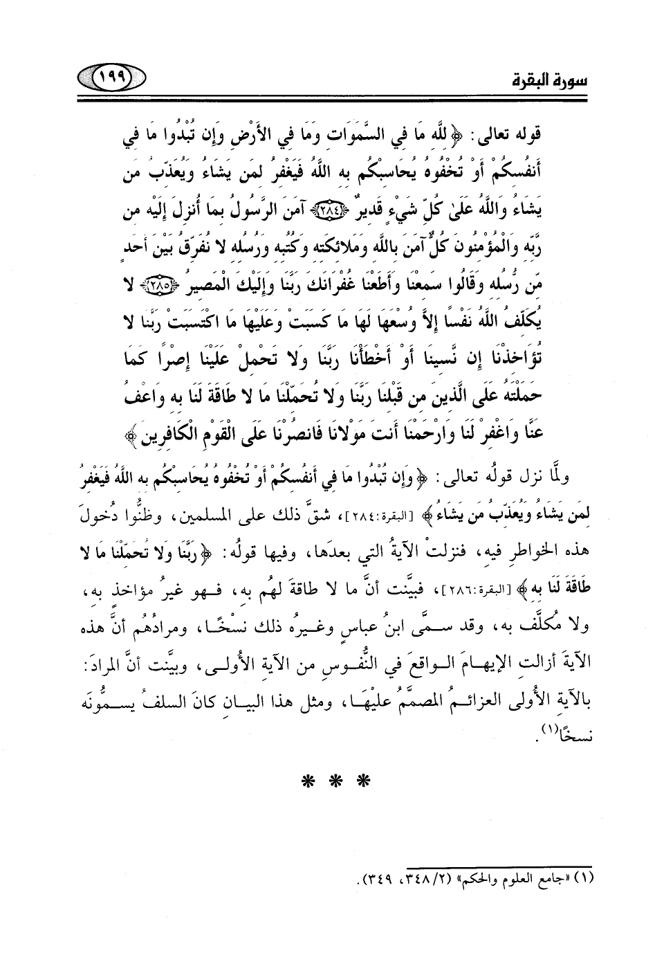 قوله تعالى: (لِلَّهِ مَا فِي السَّمَاوَاتِ وَمَا فِي الْأَرْضِ وَإِنْ تُبْدُوا مَا فِي أَنْفُسِكُمْ أَوْ تُخْفُوهُ يُحَاسِبْكُمْ بِهِ اللَّهُ فَيَغْفِرُ لِمَنْ يَشَاءُ وَيُعَذِّبُ مَنْ يَشَاءُ وَاللَّهُ عَلَى كُلِّ شَيْءٍ قَدِيرٌ (284) آمَنَ الرَّسُولُ بِمَا أُنْزِلَ إِلَيْهِ مِنْ رَبِّهِ وَالْمُؤْمِنُونَ كُلٌّ آمَنَ بِاللَّهِ وَمَلَائِكَتِهِ وَكُتُبِهِ وَرُسُلِهِ لَا نُفَرِّقُ بَيْنَ أَحَدٍ مِنْ رُسُلِهِ وَقَالُوا سَمِعْنَا وَأَطَعْنَا غُفْرَانَكَ رَبَّنَا وَإِلَيْكَ الْمَصِيرُ (285) لَا يُكَلِّفُ اللَّهُ نَفْسًا إِلَّا وُسْعَهَا لَهَا مَا كَسَبَتْ وَعَلَيْهَا مَا اكْتَسَبَتْ رَبَّنَا لَا تُؤَاخِذْنَا إِنْ نَسِينَا أَوْ أَخْطَأْنَا رَبَّنَا وَلَا تَحْمِلْ عَلَيْنَا إِصْرًا كَمَا حَمَلْتَهُ عَلَى الَّذِينَ مِنْ قَبْلِنَا رَبَّنَا وَلَا تُحَمِّلْنَا مَا لَا طَاقَةَ لَنَا بِهِ وَاعْفُ عَنَّا وَاغْفِرْ لَنَا وَارْحَمْنَا أَنْتَ مَوْلَانَا فَانْصُرْنَا عَلَى الْقَوْمِ الْكَافِرِينَ (286)