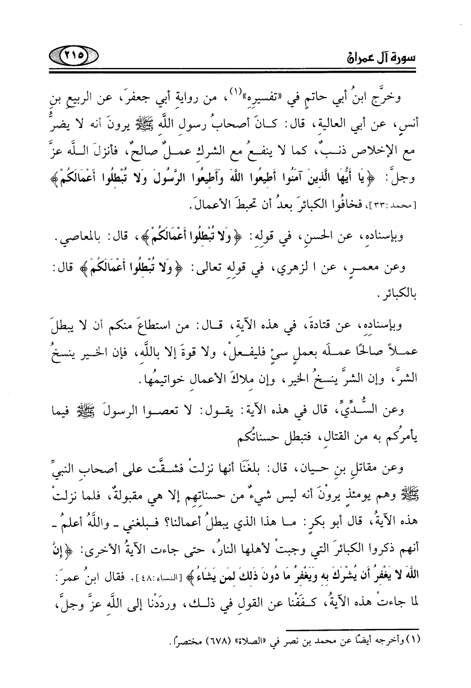 أنسٍ، عن أبي العاليةِ، قال: كانَ أصحابُ رسولِ اللَّهِ - صلى الله عليه وسلم - يرونَ أنه لا يضرّ مع الإخلاص ذنبٌ، كما لا ينفعُ مع الشركِ عملٌ صالحٌ، فأنزلَ الله عزَّ وجلَّ: (يَا أَيهَا الَّذِينَ آمَنُوا أَطِيعوا اللَّهَ وَأَطِيعوا الرَّسولَ وَلا تبْطِلُوا أَعْمَالَكمْ) .