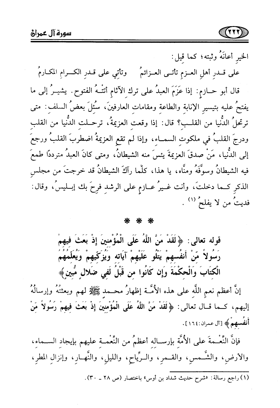 قوله تعالى: (لَقَدْ مَنَّ اللَّهُ عَلَى الْمُؤْمِنِينَ إِذْ بَعَثَ فِيهِمْ رَسُولًا مِنْ أَنْفُسِهِمْ يَتْلُو عَلَيْهِمْ آيَاتِهِ وَيُزَكِّيهِمْ وَيُعَلِّمُهُمُ الْكِتَابَ وَالْحِكْمَةَ وَإِنْ كَانُوا مِنْ قَبْلُ لَفِي ضَلَالٍ مُبِينٍ (164)