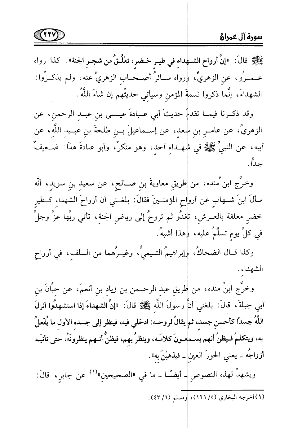 كذا رواه عمرُو، عنِ الزهريّ، ورواه سائرُ أصحابِ الزهريِّ عنه، ولم يذكرُوا: الشهداءَ، إنَّما ذكروا نسمةَ المؤمنِ وسيأتِي حديثُهم إن شاءَ اللَّهُ.