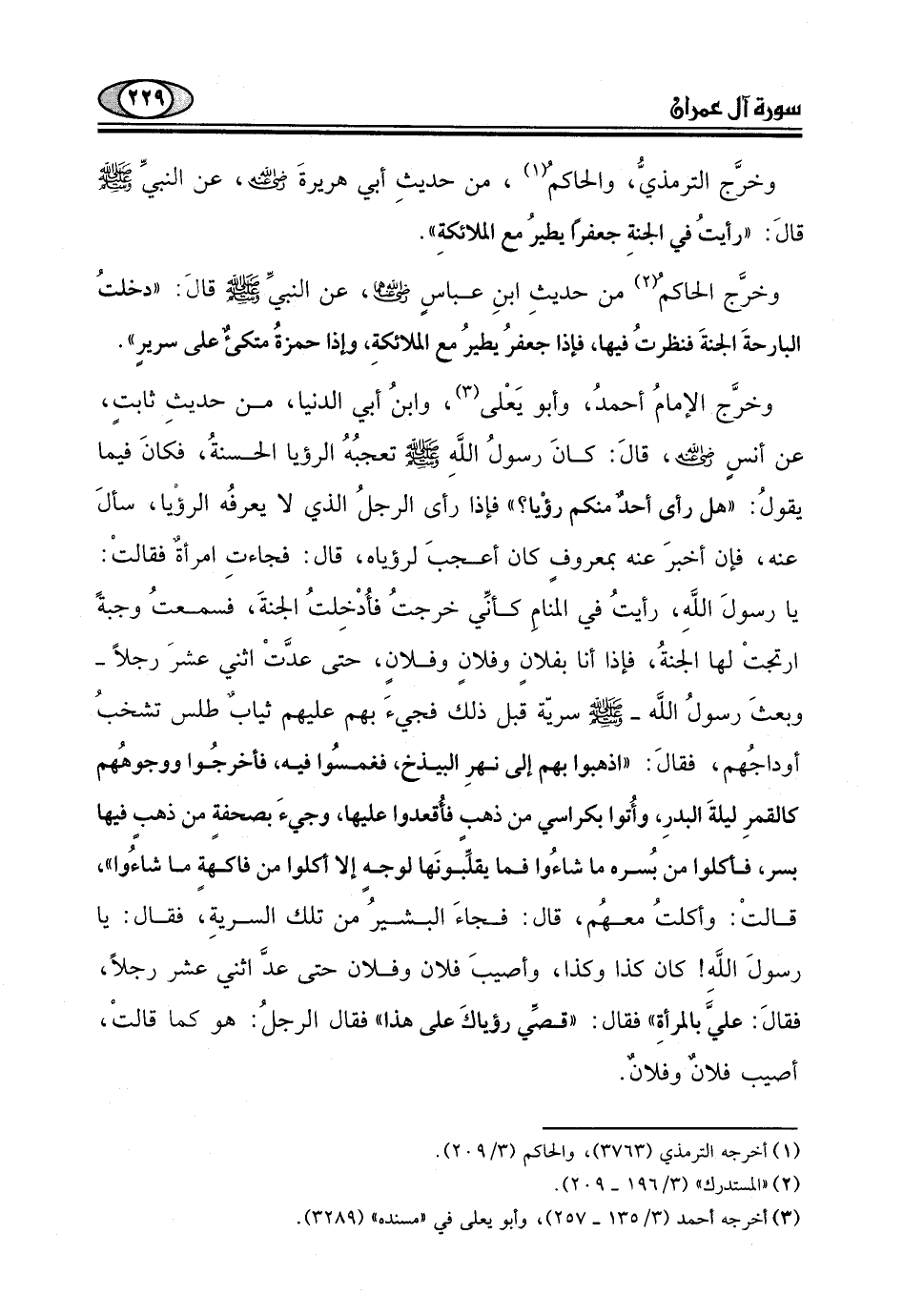 "دخلتُ البارحةَ الجنةَ فنظرتُ فيها، فإذا جعفرُ يطيرُ مع الملائكةِ، وإذا حمزةُ متكئٌ على سرير".