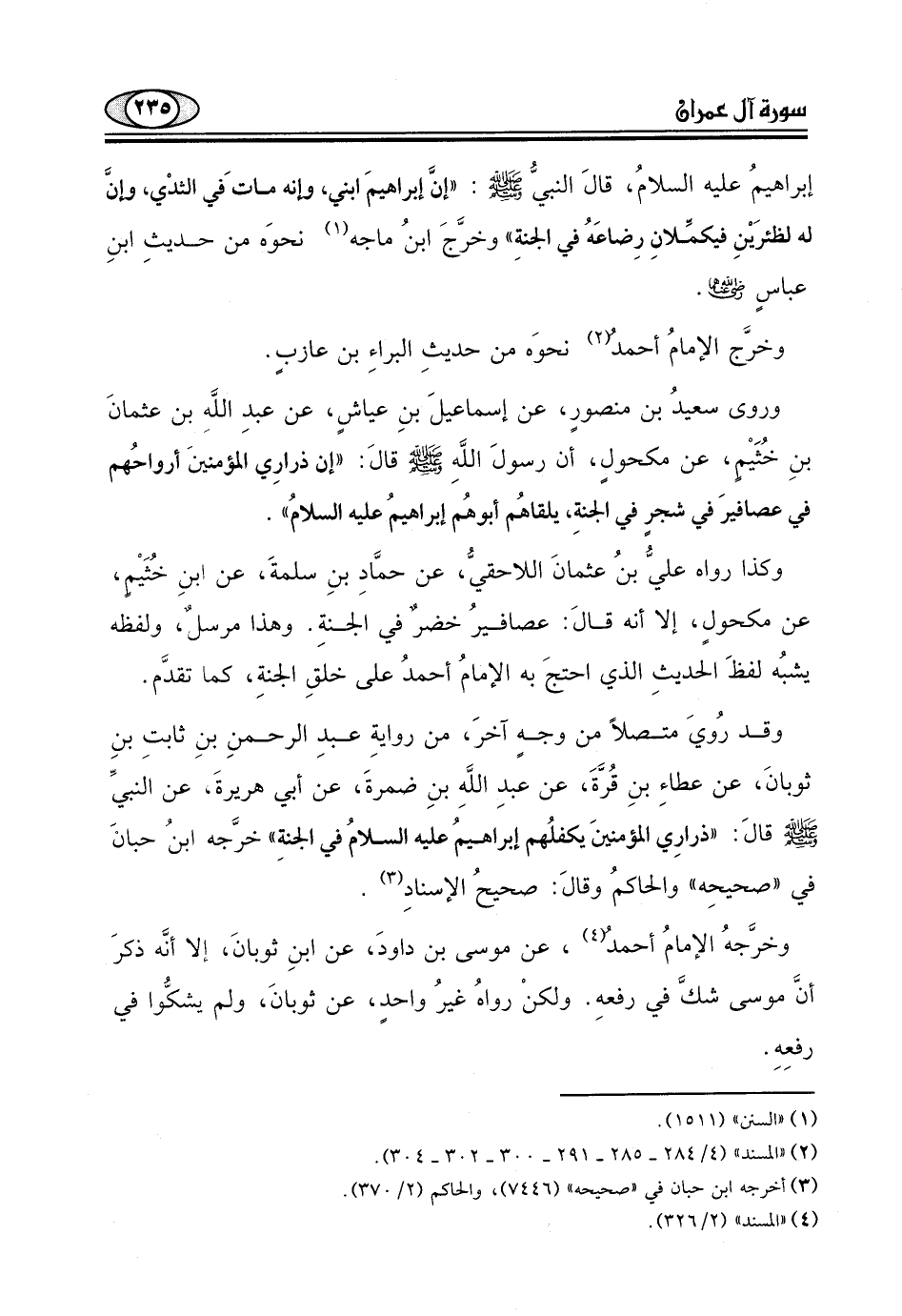 "إن ذرارِي المؤمنينَ أرواحُهم في عصافيرَ في شجرٍ في الجنةِ، يلقاهُم أبوهُم إبراهيمُ عليه السلامُ ".