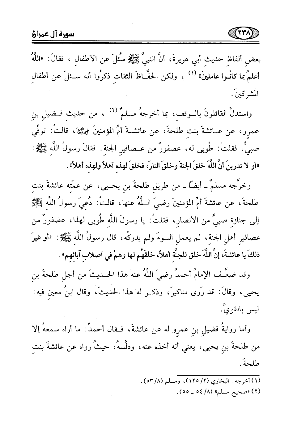 طلحةَ، عن عائشةَ أمِّ المؤمنينَ رضيَ اللَّهُ عنها، قالتْ: دُعِيَ رسولُ اللَّهِ - صلى الله عليه وسلم - إلى جنازةِ صبيٍّ من الأنصارِ، فقلتُ: يا رسولَ اللَّهِ طُوبى لهذا، عصفور من عصافيرِ أهلِ الجنةِ، لم يعملِ السوءَ ولم يدركه، قال رسولُ اللَّهِ - صلى الله عليه وسلم -: "أو غيرَ ذلكَ يا عائشةَ، إن اللَّهَ خلق للجنَّةِ أهلاً، خلقَهُم لها وهمْ في أصلابِ آبائِهِم ".