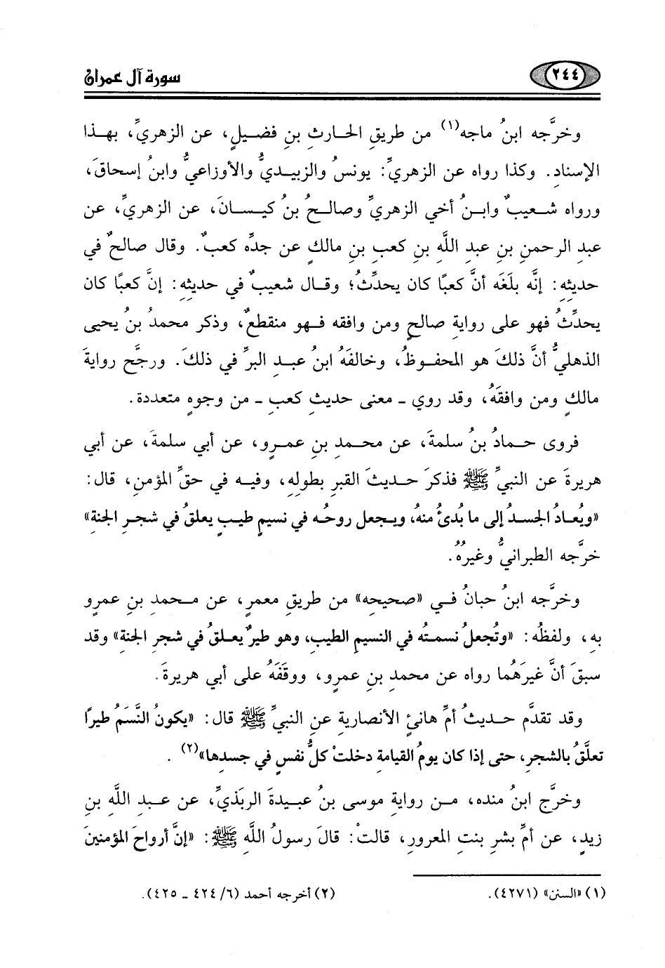 وقد تقدَّم حديثُ أمِّ هانئ الأنصاريةِ عنِ النبيِّ - صلى الله عليه وسلم - قال: "يكونُ النَّسَمُ طيرًا تعلَّقُ بالشجرِ، حتى إذا كان يومُ القيامةِ دخلتْ كلّ نفسي في جسدِها".
