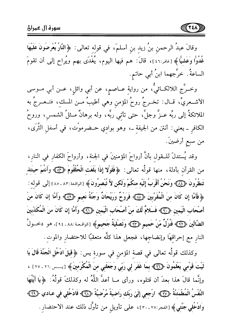 إلى قولِهِ: (فَأَمَّا إِنْ كَانَ مِنَ الْمُقَرَّبِينَ (88) فَرَوْحٌ وَرَيْحَانٌ وَجَنَّتُ نَعِيمٍ (89) وَأَمَّا إِنْ كَانَ مِنْ أَصْحَابِ الْيَمِينِ (90) فَسَلَامٌ لَكَ مِنْ أَصْحَابِ الْيَمِينِ (91) وَأَمَّا إِنْ كَانَ مِنَ الْمُكَذِّبِينَ الضَّالِّينَ (92) فَنُزُلٌ مِنْ حَمِيمٍ (93) وَتَصْلِيَةُ جَحِيمٍ (94) .