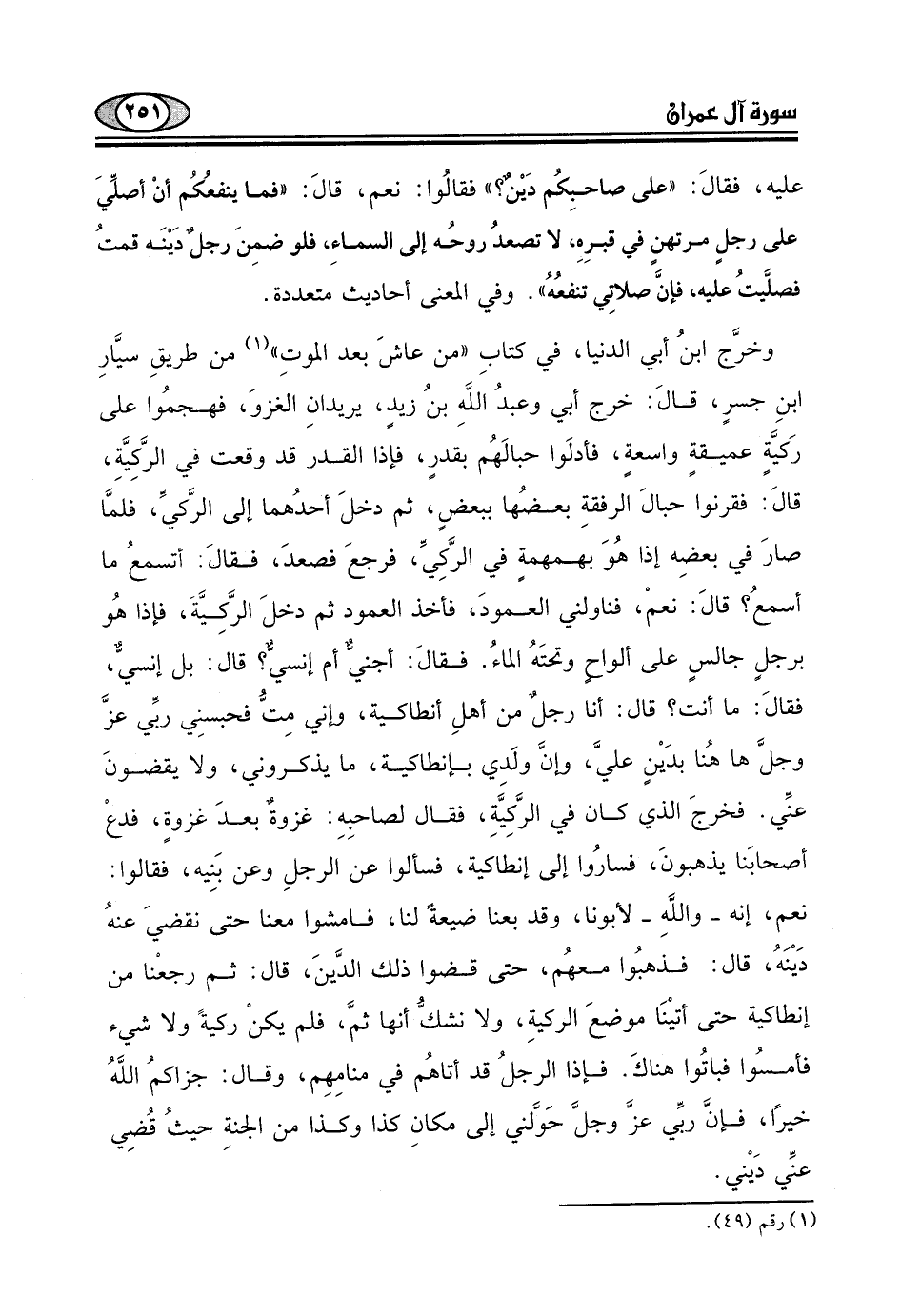 قال: أنا رجل من أهلِ إنطاكية، وإني مِتُّ فحبسنِي ربِّي عزَّ وجلَّ ها هُنا بدَيْنٍ عليَّ، وإن ولَدي بإنطاكية، ما يذكروني، ولا يقضونَ عنَي.