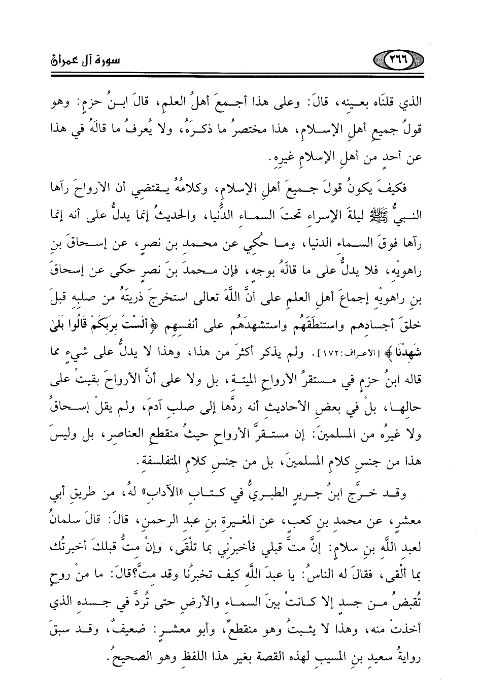 النبيُّ - صلى الله عليه وسلم - ليلةَ الإسراءِ تحتَ السماءِ الدُّنيا، والحديثُ إنما يدلُّ على أنه إنما راَها فوقَ السماءِ الدنيا، وما حُكِي عن محمدِ بن نصرٍ، عن إسحاقَ بنِ راهويْهِ، فلا يدلُّ على ما قالَهُ بوجهٍ، فإن محمدَ بنَ نصرٍ حكى عن إسحاقَ بنِ راهويْهِ إجماعَ أهلِ العلم على أنَّ اللَّهَ تعالى استخرجَ ذريتَهُ من صلبِهِ قبلَ خلقَ أجسادِهم واستنطَقَهُم واستشهدَهُم على أنفسِهِم (ألَسْتُ بِرَبِّكم قَالُوا بَلَى شَهِدْنَا) .