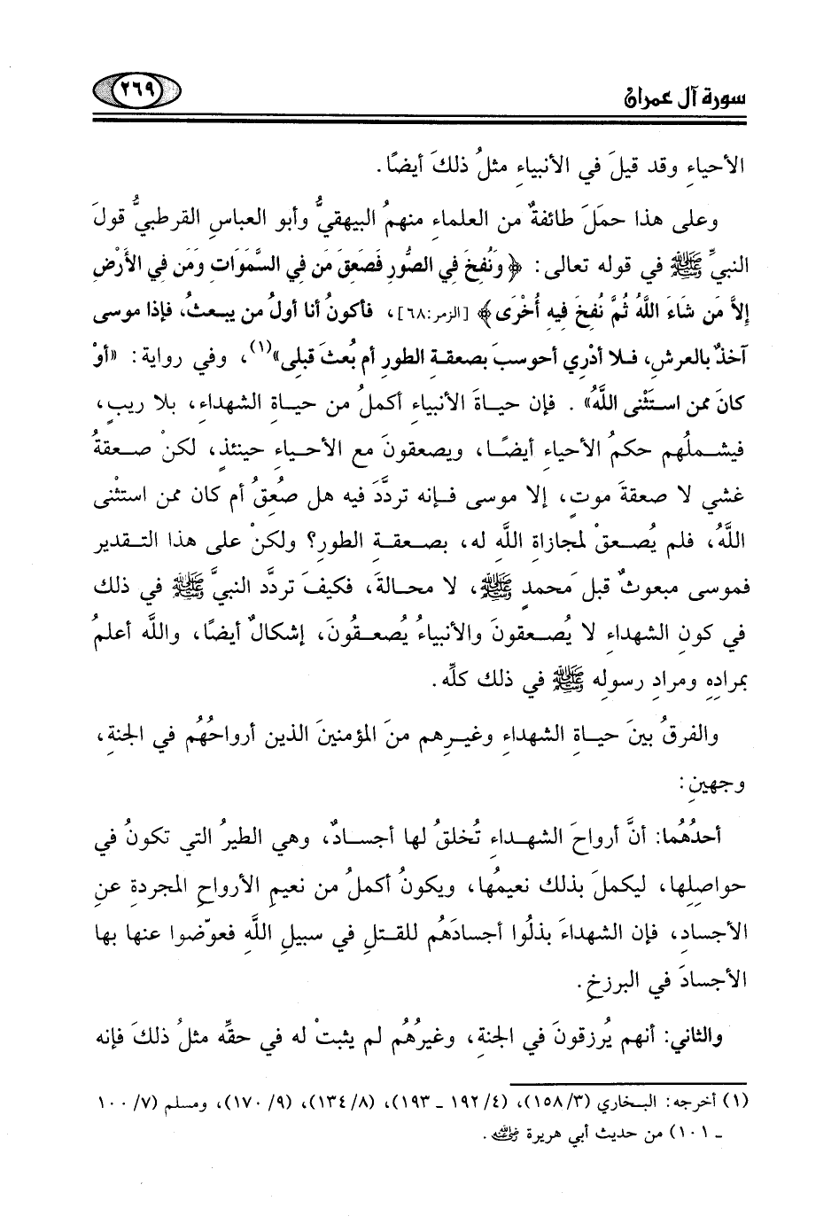 والفرقُ بينَ حياةِ الشهداءِ وغيرِهم منَ المؤمنينَ الذين أرواحُهُم في الجنةِ.