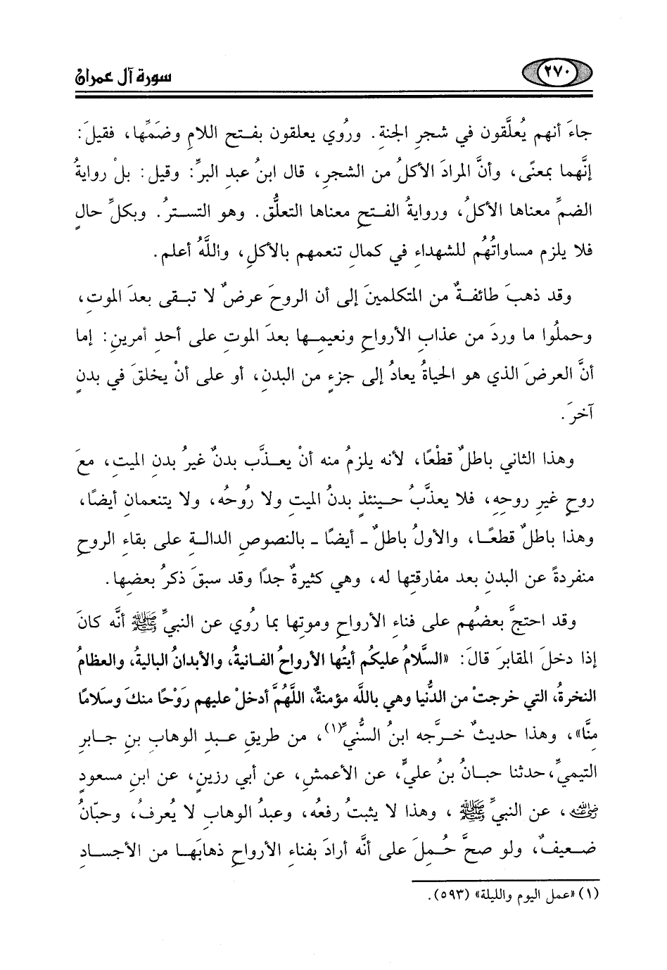 التيميِّ، حدثنا حبانُ بنُ عليٍّ، عن الأعمشِ، عن أبي رزينٍ، عن ابنِ مسعودٍ - رضي الله عنه -، عن النبيِّ - صلى الله عليه وسلم -، وهذا لا يثبت رفعُه، وعبدُ الوهابِ لا يُعرفُ، وحبّانُ ضعيف، ولو صحَّ حُمِلَ على أنَّه أرادَ بفناءِ الأرواح ذهابَها من الأجسادِ