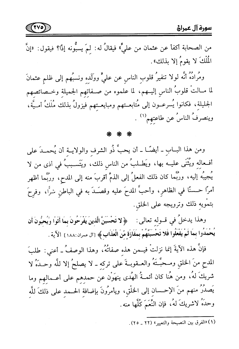 وهذا يدخلُ في قولِهِ تعالى: (لَا تَحْسَبَنَّ الَّذِينَ يَفْرَحُونَ بِمَا أَتَوْا وَيُحِبُّونَ أَنْ يُحْمَدُوا بِمَا لَمْ يَفْعَلُوا فَلَا تَحْسَبَنَّهُمْ بِمَفَازَةٍ مِنَ الْعَذَابِ) ، الآية.