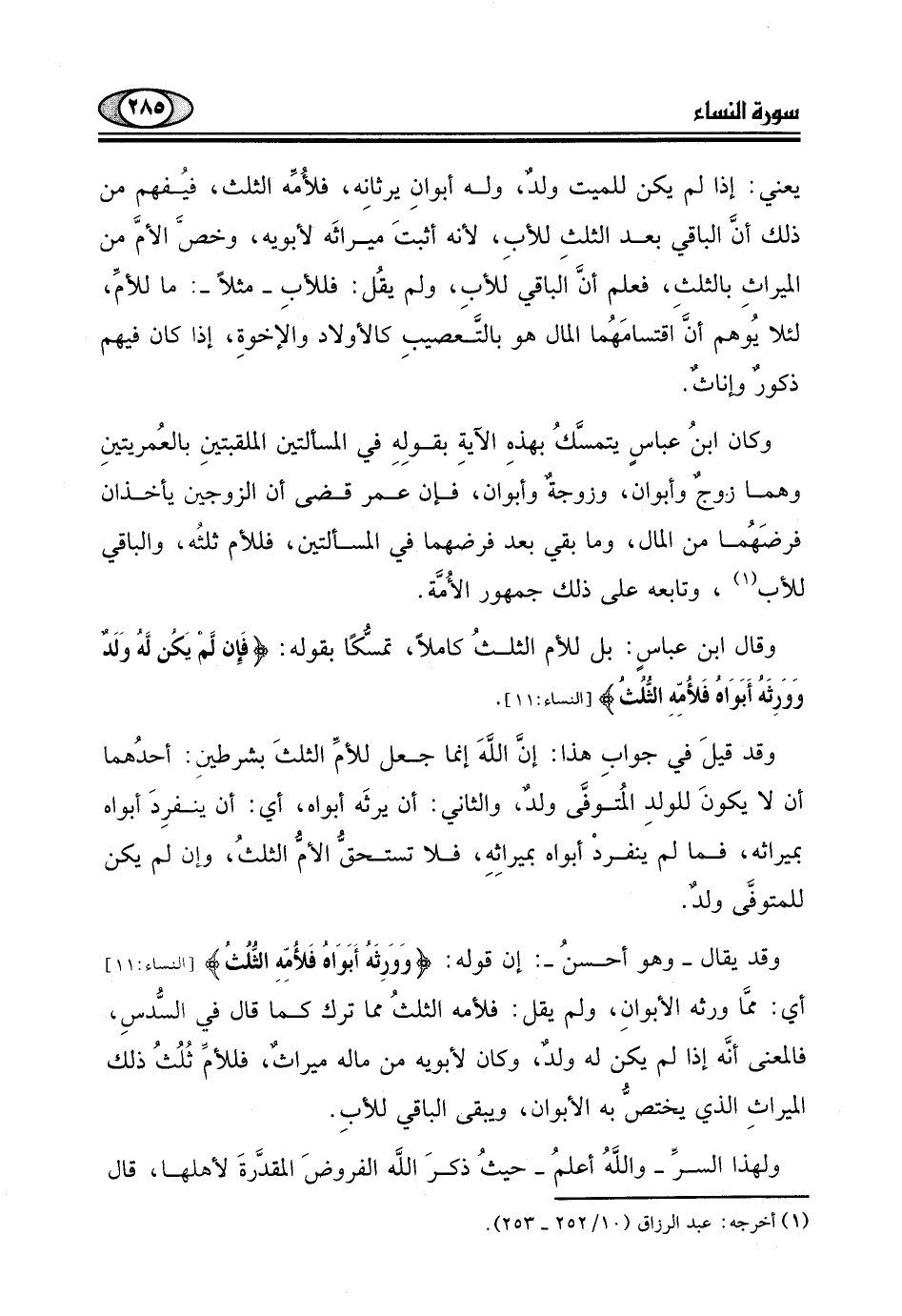وقال ابن عباسٍ: بل للأم الثلثُ كاملاً، تمسُّكًا بقوله: (فَإِن لَمْ يَكُن لَّهُ وَلَدٌ