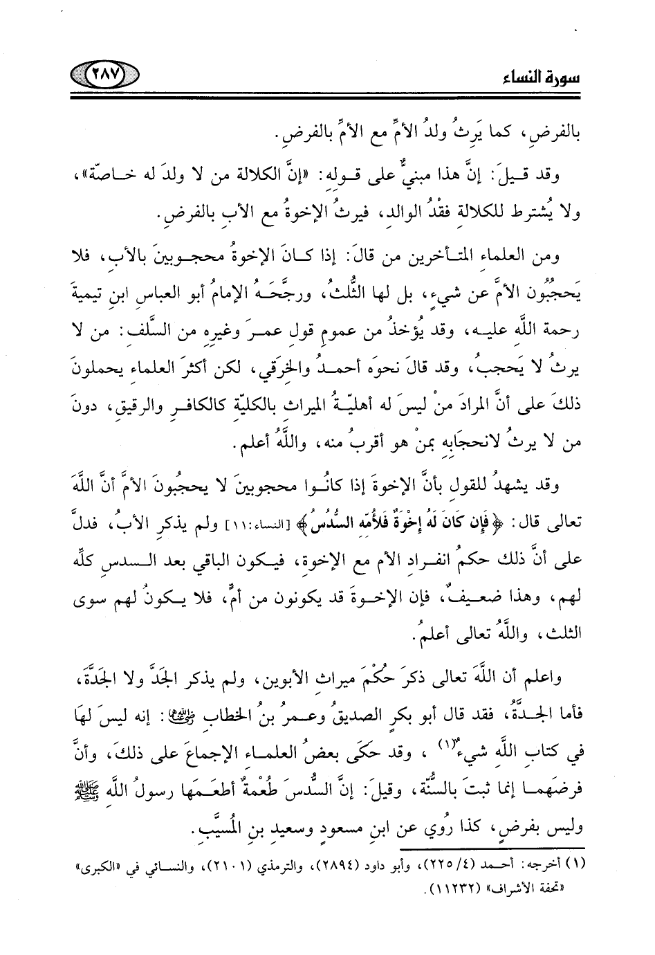 يَحجُبُون الأمَ عن شيءٍ، بل لها الثُّلثُ، ورجَّحَهُ الإمامُ أبو العباسِ ابنِ تيميةَ