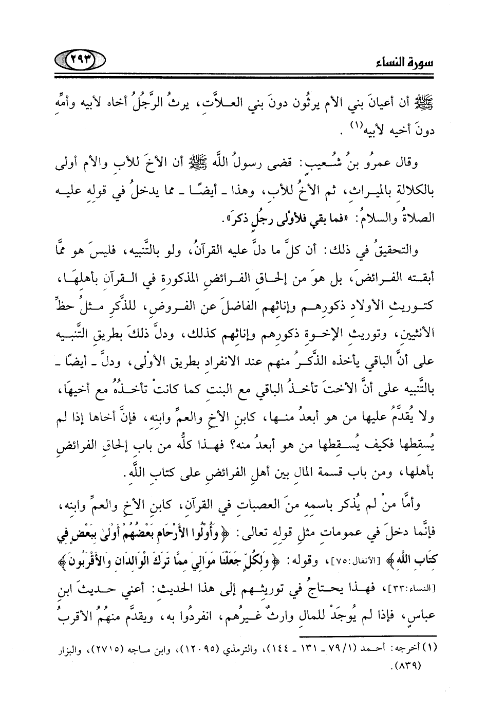 وقال عمرُو بنُ شُعيبٍ: قضى رسولُ اللَّه - صلى الله عليه وسلم - أن الأخَ للأبِ والأم أولى بالكلالةِ بالميراثِ، ثم الأخُ للأبِ، وهذا - أيضا - مما يدخلُ في قولِهِ عليه الصلاةُ والسلامُ: "فما بقي فلأوْلى رجُلٍ ذكرَ".