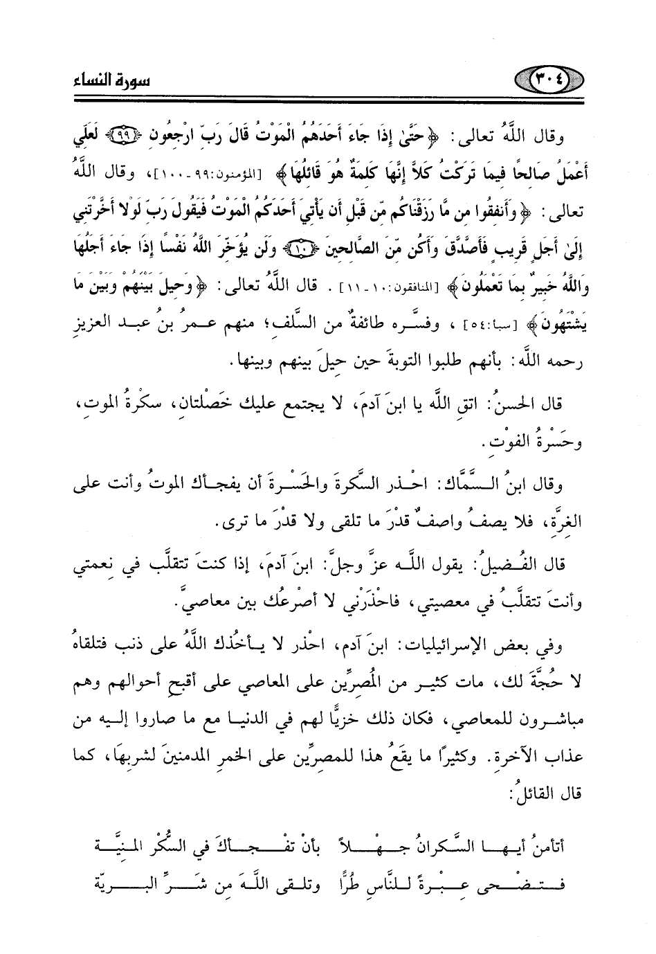وقال ابنُ السَّمَّاك: احْذر السَّكرةَ والحَسْرةَ أن يفجأك الموتُ وأنت على