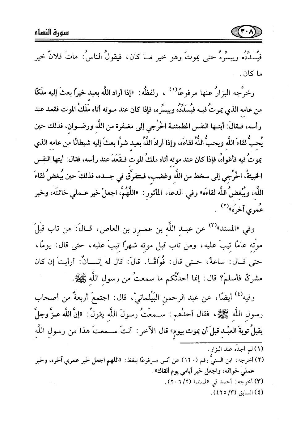 رأسه، فقالَ: أيتها النفس المطمئنة اخْرُجي إلى مغفرة من اللَّهِ ورضوانٍ، فذلك حين يُحِبُّ لقاءَ اللهِ ويحبُّ اللُّهُ لقاءَه، وإذا أرادَ اللَهُ بعبدٍ شرًّا بعثَ إليه شيطانًا من عامِهِ الذي يموتُ فيه فأغواهُ، فإذا كان عند موتِهِ أتاه ملكُ الموت فقَعَدَ عند رأسه، فقال: أيتها النفس الخبيثةُ، اخْرُجِي إلى سخط من اللَهِ وغضبٍ، فتتفرق في جسده، فذلكَ حين يُبغضُ لقاءَ اللهِ، ويُبْغِضُ الله لقاءَه "وفي الدعاء المأثورِ: "اللهمَّ، اجعلْ خير عملي خاتمتَه، وخير عمري آخره"