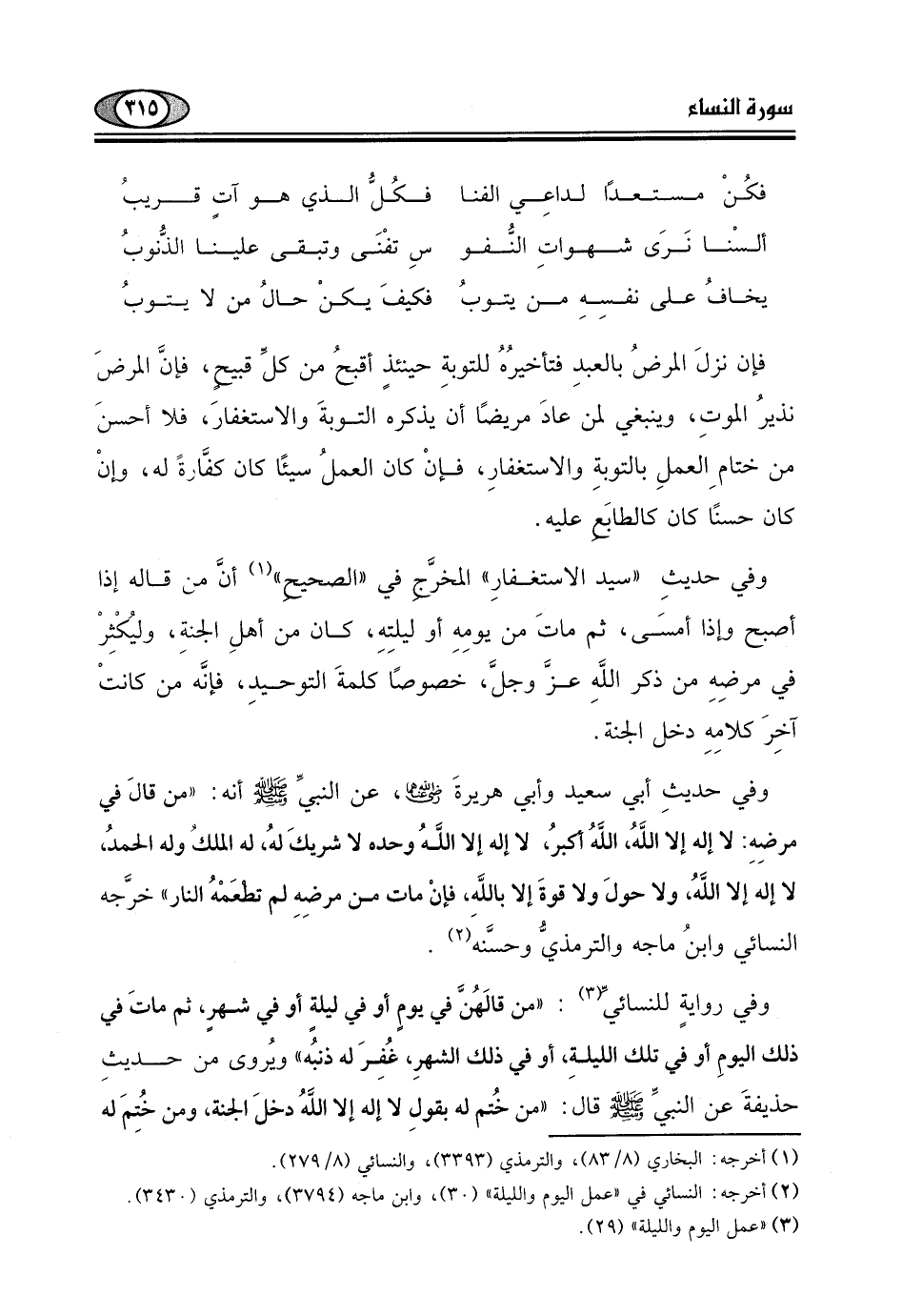وفي حديثِ أبي سعيد وأبي هريرةَ، عن النبيِّ - صلى الله عليه وسلم - أنه: "من قالَ في مرضِهِ: لا إله إلا اللَّهُ، اللَّهُ أكبرُ، لا إله إلا اللَّهُ وحده لا شريكَ لهُ، له الملك وله الحمدُ، لا إله إلا اللَّهُ، ولا حولَ ولا قوةَ إلا باللَّهِ، فإنْ مات من مرضه لم تطعَمْهُ النار".