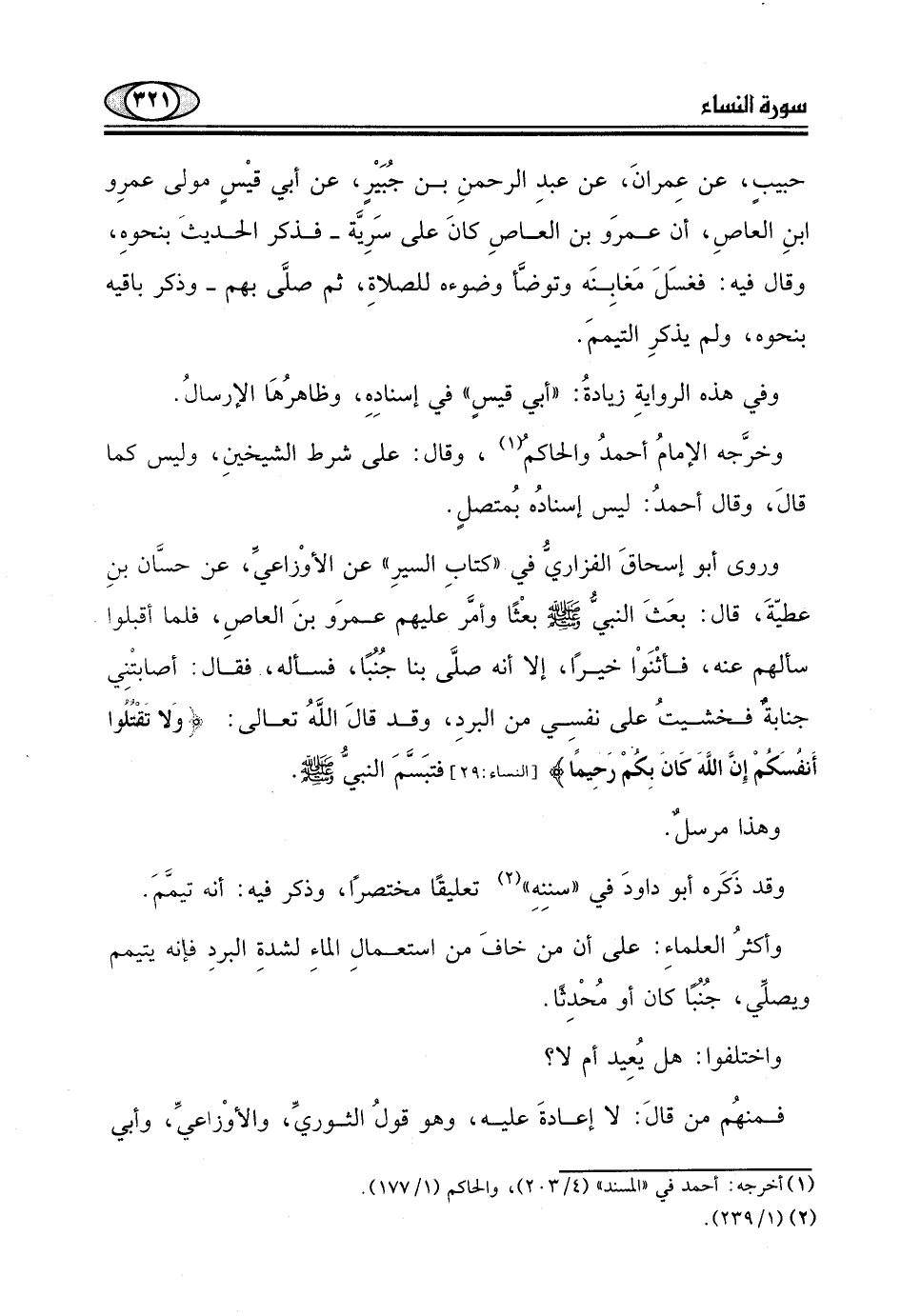 عطيّةَ، قال: بعَثَ النبيُّ - صلى الله عليه وسلم - بعْثًا وأمَّر عليهم عمرَو بنَ العاصِ، فلما أقبلوا سألهم عنه، فأثْنَوْا خيرًا، إلا أنه صلَّى بنا جُنبا، فسأله، - فقال: أصابتْنِي جنابة فخشيتُ على نفسِي من البردِ، وقد قال اللَّهُ تعالى: (وَلا تقْتُلوا أَنفسَكُمْ إِنَّ اللَّهَ كَانَ بِكمْ رَحِيمًا) ، فتيبسَّمَ النبيُّ - صلى الله عليه وسلم -.