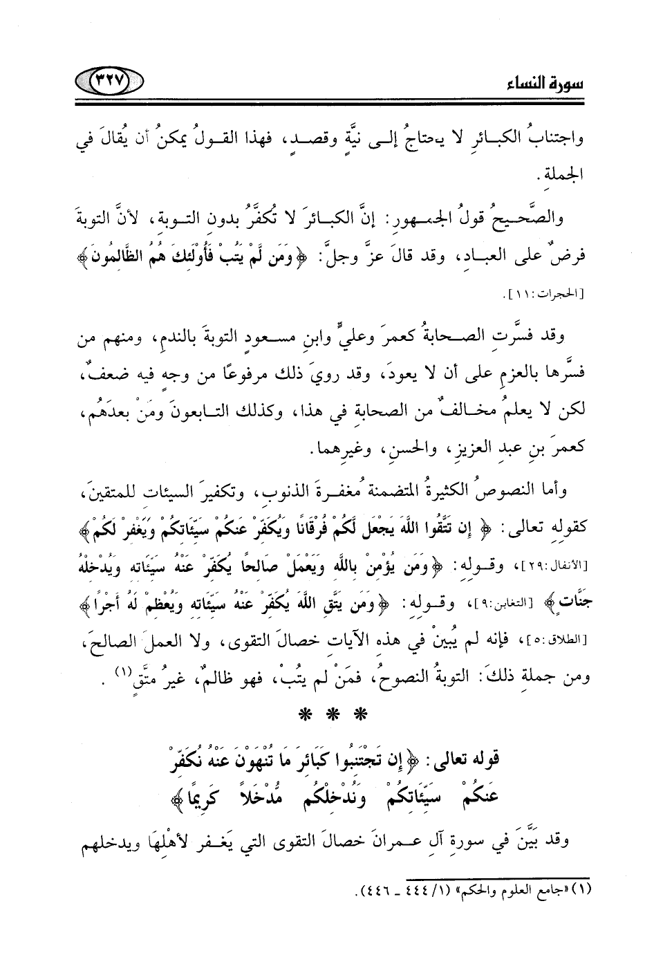 قوله تعالى: (إِنْ تَجْتَنِبُوا كَبَائِرَ مَا تُنْهَوْنَ عَنْهُ نُكَفِّرْ عَنْكُمْ سَيِّئَاتِكُمْ وَنُدْخِلْكُمْ مُدْخَلًا كَرِيمًا (31)