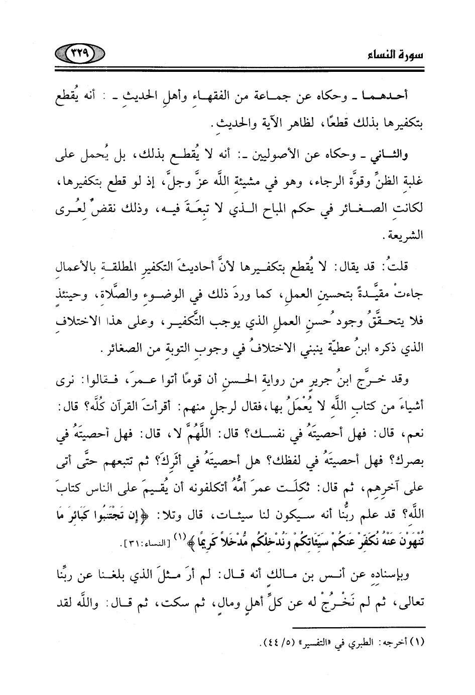 هل أحصيتَهُ في أثَرِكَ؟ ثم تتبعهم حتَّى أتى على آخرِهِم، ثم قال: ثكِلَت عمرَ أمُّهُ أتكلفونه أن يُقيمَ على الناس كتابَ اللَّهِ؟ قد علم ربُّنا أنه سيكون لنا سيئات، قال وتلا: (إِنْ تَجْتَنِبُوا كَبَائِرَ مَا تُنْهَوْنَ عَنْهُ نُكَفِّرْ عَنْكُمْ سَيِّئَاتِكُمْ وَنُدْخِلْكُمْ مُدْخَلًا كَرِيمًا (31) .