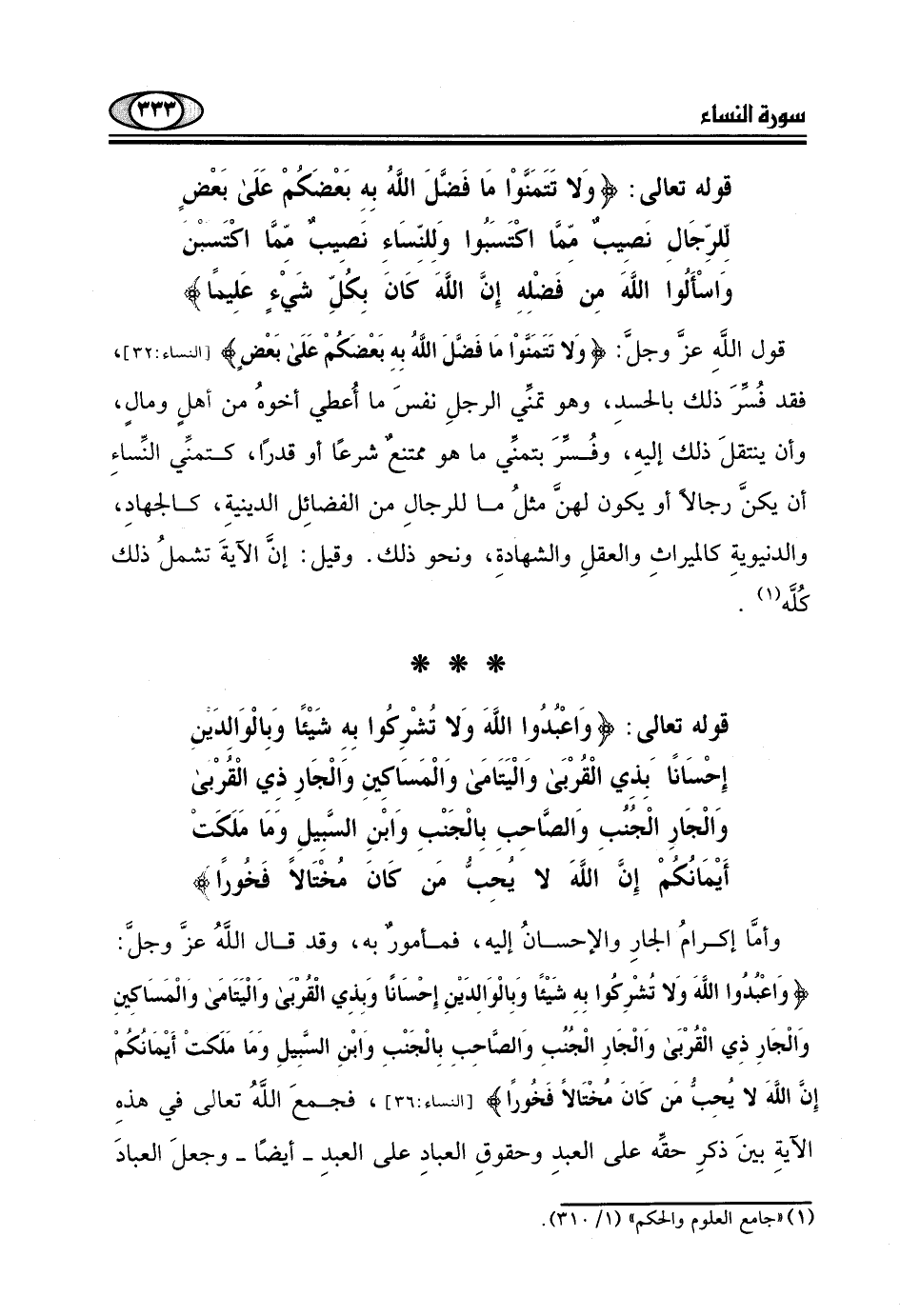 (وَاعْبُدُوا اللَّهَ وَلَا تُشْرِكُوا بِهِ شَيْئًا وَبِالْوَالِدَيْنِ إِحْسَانًا وَبِذِي الْقُرْبَى وَالْيَتَامَى وَالْمَسَاكِينِ وَالْجَارِ ذِي الْقُرْبَى وَالْجَارِ الْجُنُبِ وَالصَّاحِبِ بِالْجَنْبِ وَابْنِ السَّبِيلِ وَمَا مَلَكَتْ أَيْمَانُكُمْ إِنَّ اللَّهَ لَا يُحِبُّ مَنْ كَانَ مُخْتَالًا فَخُورًا) .