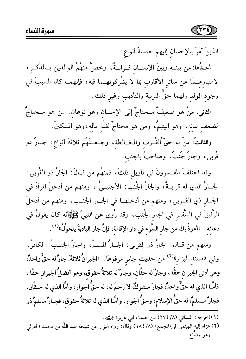 فأمَّا الذي له حق واحد فجارْ مشركٌ لا رَحِمَ له، له حقُّ الجوارِ، وأمَّا الذي له حقَّانِ، فجارٌ مسلمٌ له حقُّ الإسلام، وحقّ الجوارِ، وأمَّا الذي له ثلاثةُ حقوقٍ، فجارٌ مسلمٌ ذو رحمٍ، له حقُّ الإسلام،