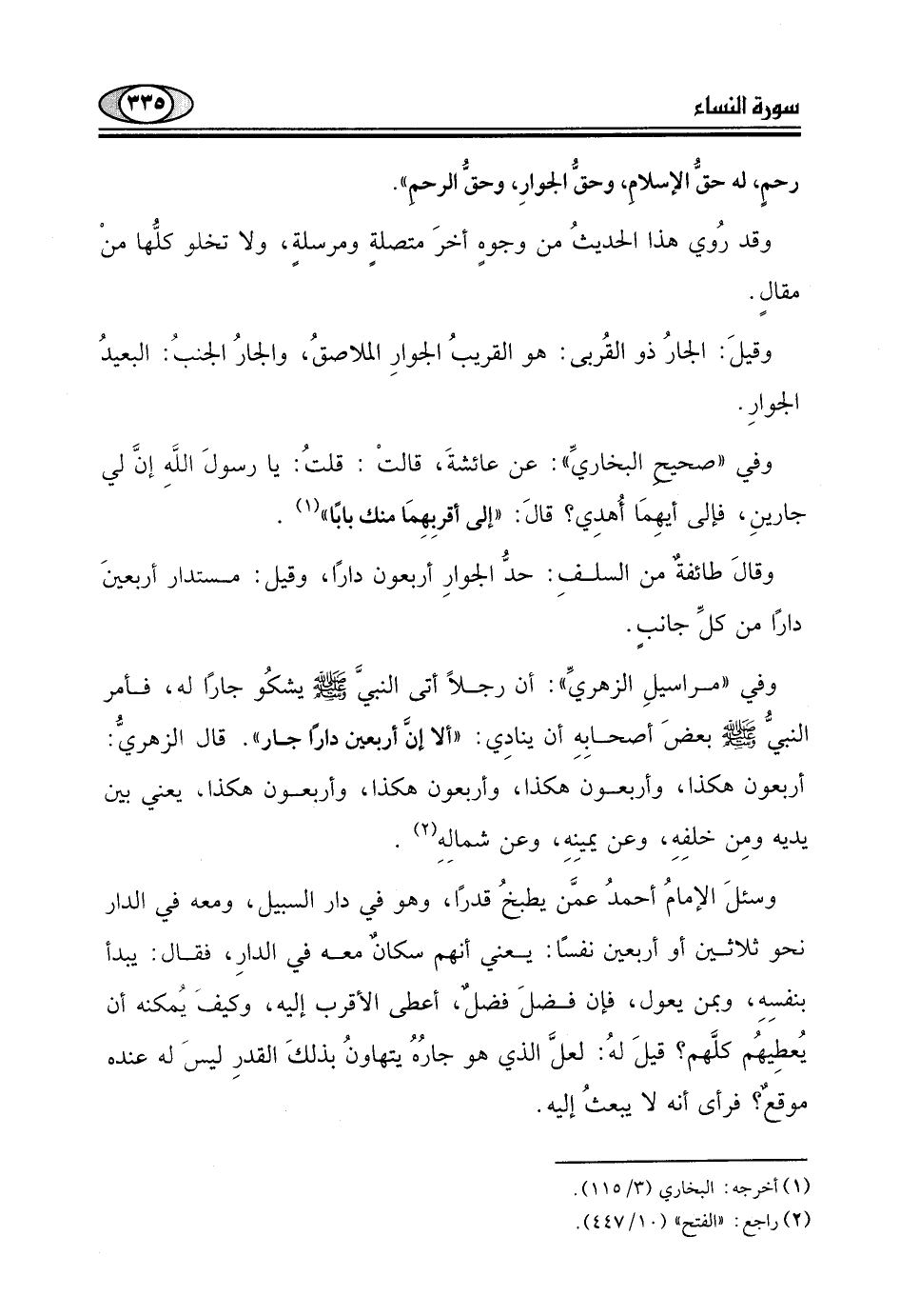 وقالَ طائفة من السلفِ: حدُّ الجوارِ أربعون دارًا، وقيل: مستدار أربعينَ