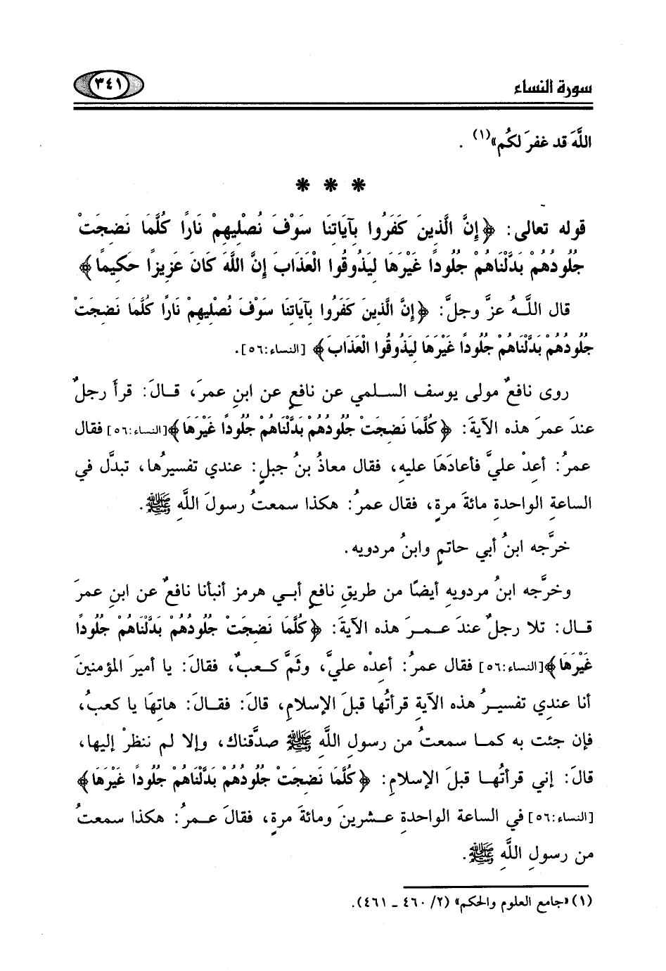 قال اللَّهُ عزَّ وجلَّ: (إِنَّ الَّذِينَ كَفَرُوا بِآيَاتِنَا سَوْفَ نُصْلِيهِمْ نَارًا كُلَّمَا نَضِجَتْ جُلُودُهُمْ بَدَّلْنَاهُمْ جُلُودًا غَيْرَهَا لِيَذُوقُوا الْعَذَابَ) .