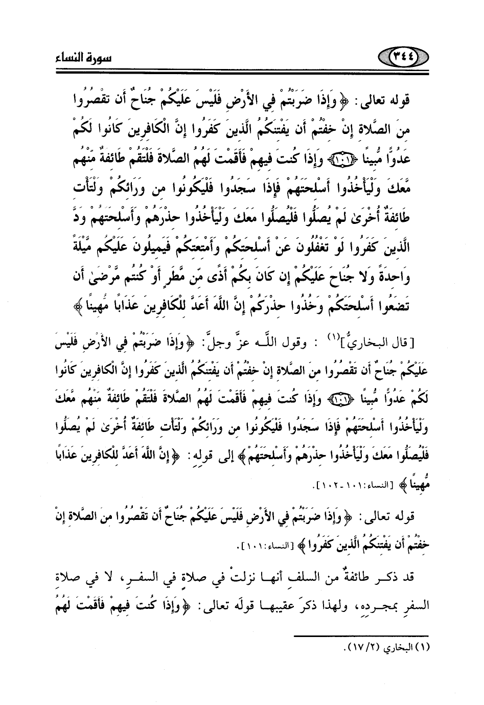 [قالَ البخاريُّ] : وقول اللَّه عزَّ وجلَّ: (وَإِذَا ضَرَبْتُمْ فِي الْأَرْضِ فَلَيْسَ عَلَيْكُمْ جُنَاحٌ أَنْ تَقْصُرُوا مِنَ الصَّلَاةِ إِنْ خِفْتُمْ أَنْ يَفْتِنَكُمُ الَّذِينَ كَفَرُوا إِنَّ الْكَافِرِينَ كَانُوا لَكُمْ عَدُوًّا مُبِينًا (101) وَإِذَا كُنْتَ فِيهِمْ فَأَقَمْتَ لَهُمُ الصَّلَاةَ فَلْتَقُمْ طَائِفَةٌ مِنْهُمْ مَعَكَ وَلْيَأْخُذُوا أَسْلِحَتَهُمْ فَإِذَا سَجَدُوا فَلْيَكُونُوا مِنْ وَرَائِكُمْ وَلْتَأْتِ طَائِفَةٌ أُخْرَى لَمْ يُصَلُّوا فَلْيُصَلُّوا مَعَكَ وَلْيَأْخُذُوا حِذْرَهُمْ وَأَسْلِحَتَهُمْ) إلى قولِهِ: (إِنَّ اللَّهَ أَعَدَّ لِلْكافِرِينَ عَذَابًا مُّهِينًا) .