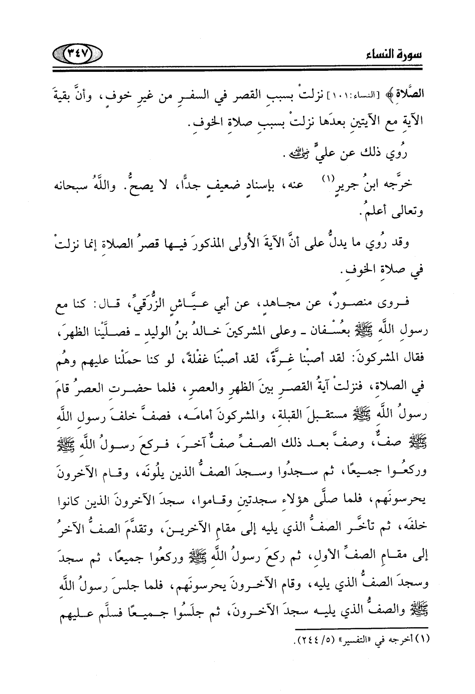 رسولِ اللَّهِ - صلى الله عليه وسلم - بعُسْفان - وعلى المشركينَ خالدُ بنُ الوليدِ - فصلَّيْنا الظهرَ، فقال المشركونَ: لقد أصبْنا غِرَّةً، لقد أصبْنَا غفْلةً، لو كنا حمَلْنا عليهم وهُم في الصلاةِ، فنزلتْ آيةُ القصرِ بينَ الظهرِ والعصرِ، فلما حضرتِ العصرُ قامَ رسولُ اللَّهِ - صلى الله عليه وسلم - مستقبلَ القبلةِ، والمشركونَ أمامَه، فصفَّ خلفَ رسولِ اللَّهِ - صلى الله عليه وسلم -.