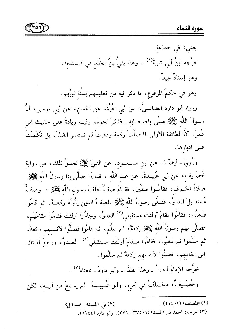 ورُويَ - أيضًا - عن ابنِ مسعود، عن النبي - صلى الله عليه وسلم - ذلك، من روايةِ خُصَيفٍ، عن أبي عُبيدةَ، عن عبدِ اللَّهِ، قالَ: صلَّى بنا رسول اللَّهِ - صلى الله عليه وسلم - صلاةَ الخوفِ، فقامُوا صفَّين، فقامَ صفٌّ خلفَ رسولِ اللَّهِ - صلى الله عليه وسلم -، وصفٌّ مُستقبلَ العدوِّ، فصلَّى رسولُ اللَّهِ - صلى الله عليه وسلم - بالصفِّ الذين يلُونَه ركعةً، ثم قامُوا