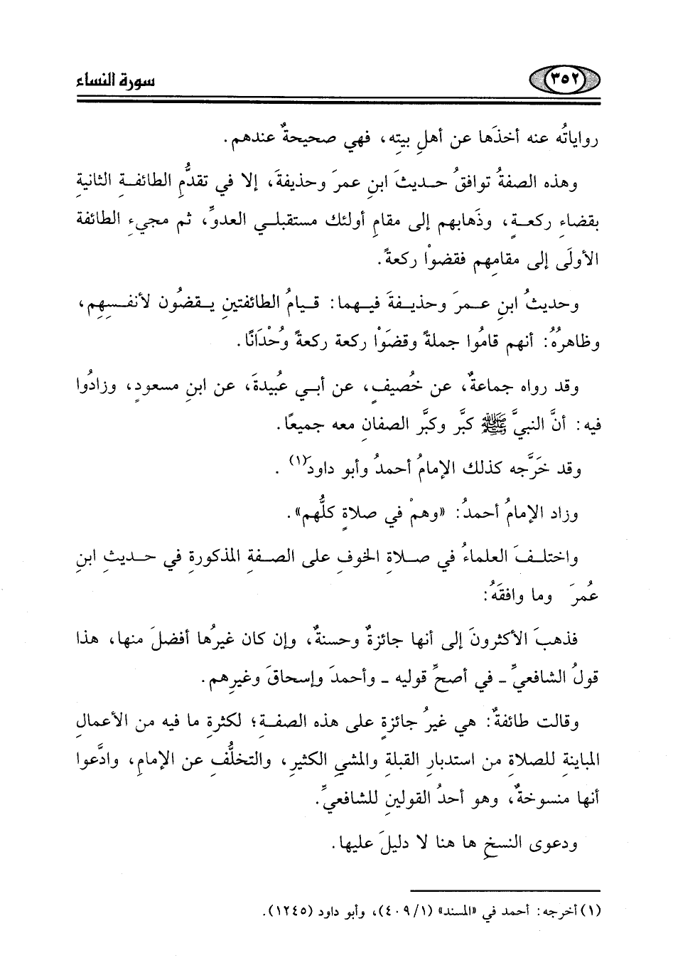 واختلفَ العلماءُ في صلاةِ الخوفِ على الصفةِ المذكورةِ في حديثِ ابنِ