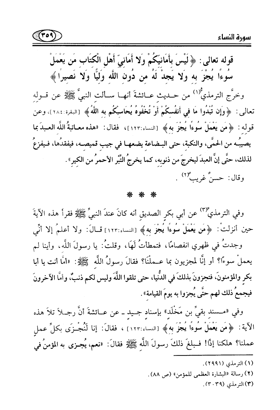 وفي الترمذي عن أبي بكرٍ الصديقِ أنه كانَ عندَ النبيِّ - صلى الله عليه وسلم - فقرأ هذه الآيةَ حين أنزلتْ: (مَن يَعْمَلْ سُوءًا يُجْزَ بِهِ) .