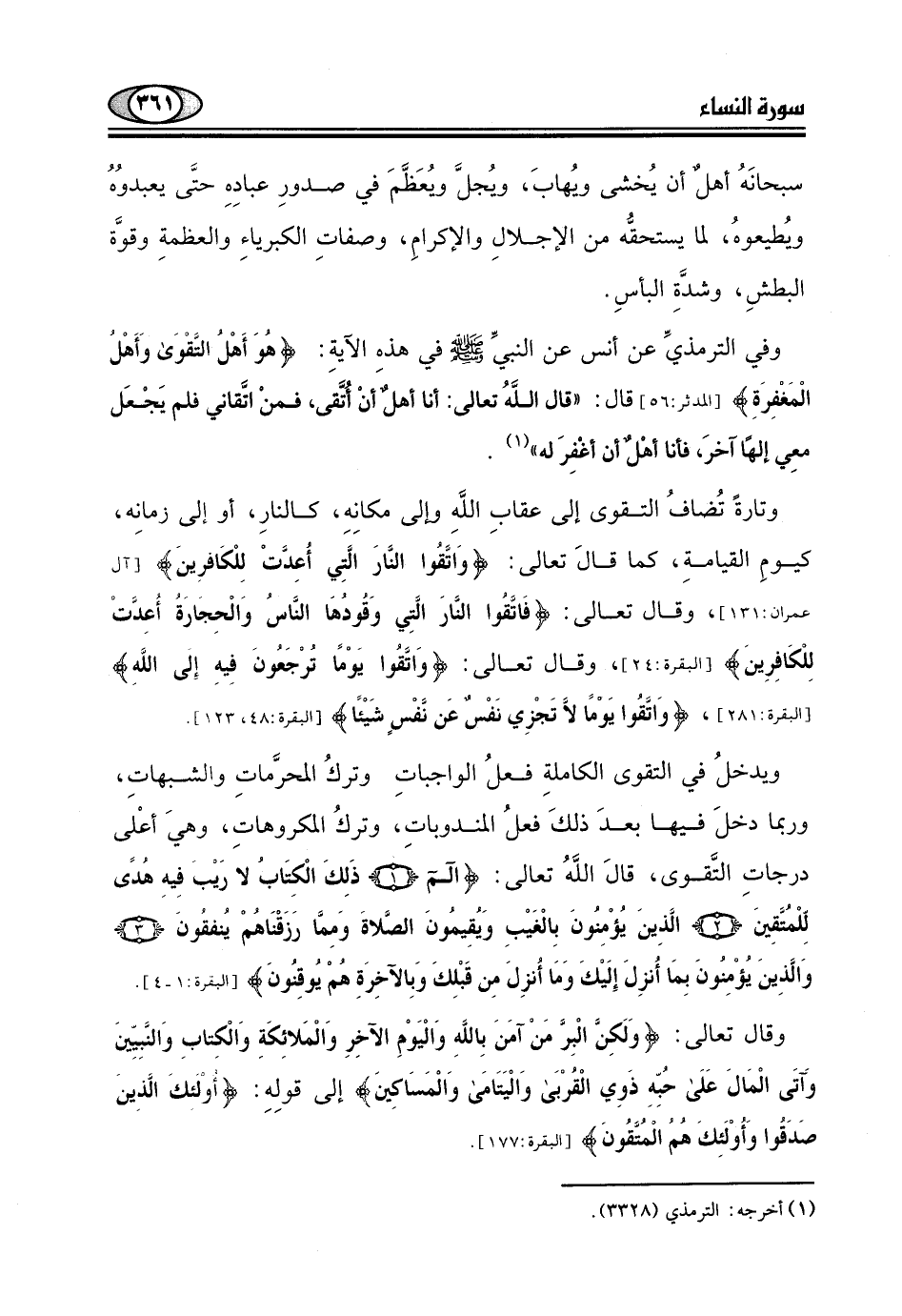 ويدخلُ في التقوى الكاملةِ فعلُ الواجباتِ وتركُ المحرَّماتِ والشبهاتِ.