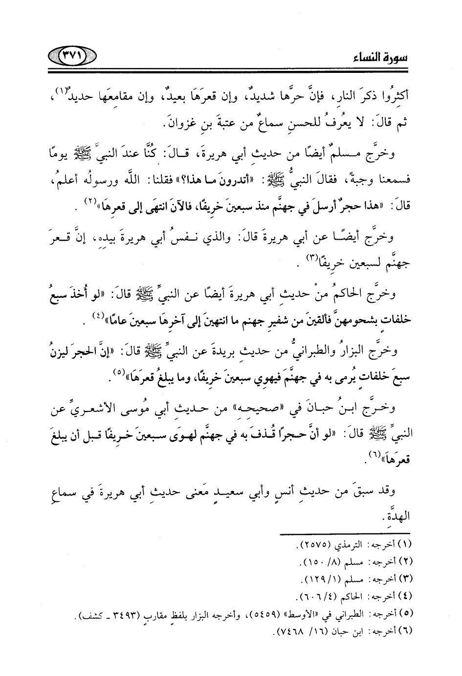 "لو أنَّ حجرًا قُذفَ به في جهنَّم لهوَى سبعينَ خرِيفًا قبل أن يبلغَ قعرَها".