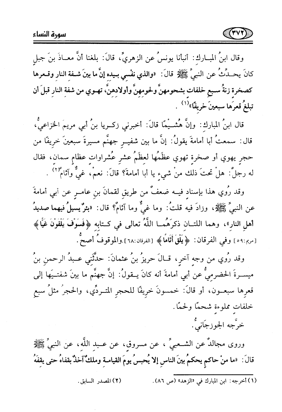 "والذي نفْسِي بيدِه إنَّ ما بينَ شفةِ النارِ وقعرها كصخرةٍ زنةُ سبع خلفات بشحومهن ولحومِهِنَّ وأولادهِنًّ، تهوي من شفة النارِ قبلَ أن