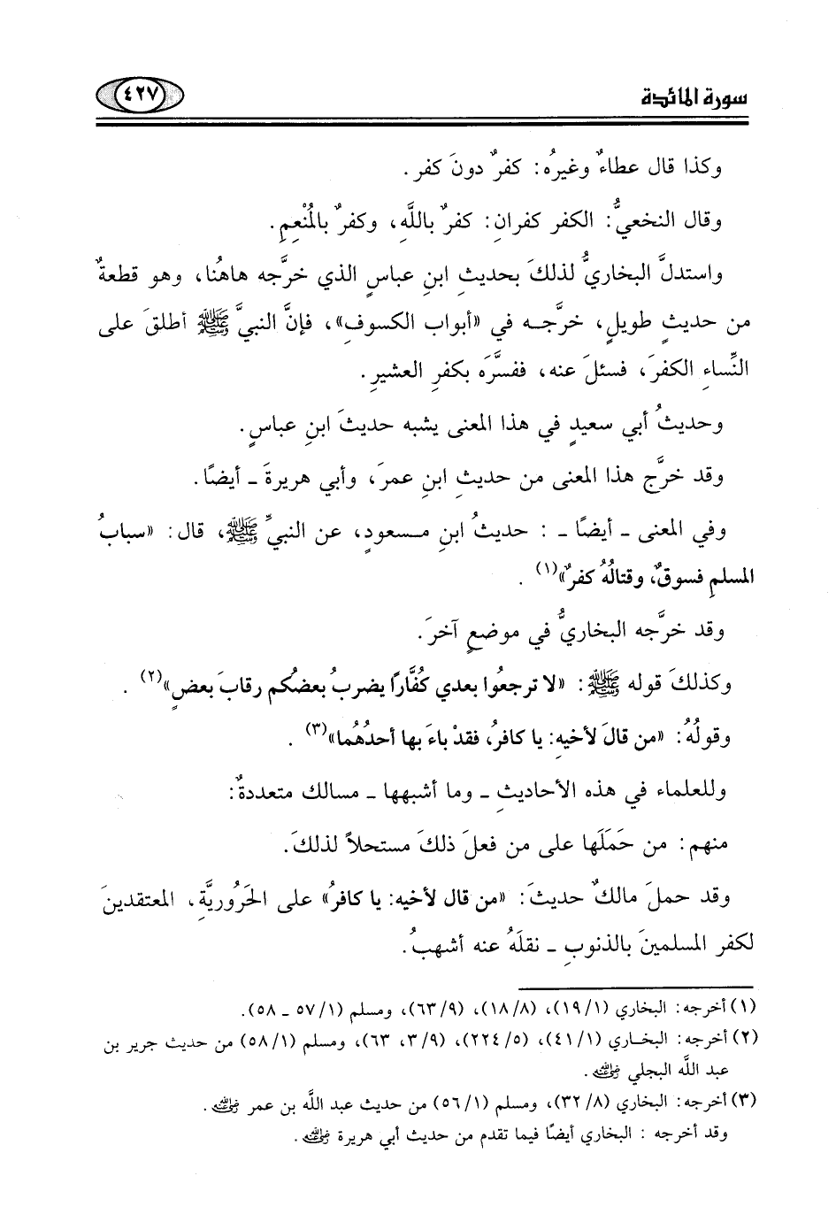 وفي المعنى - أيضًا -: حديثُ ابنِ مسعودٍ، عن النبيِّ - صلى الله عليه وسلم -، قال: "سبابُ المسلم فسوق وقتالُهُ كفرٌ".