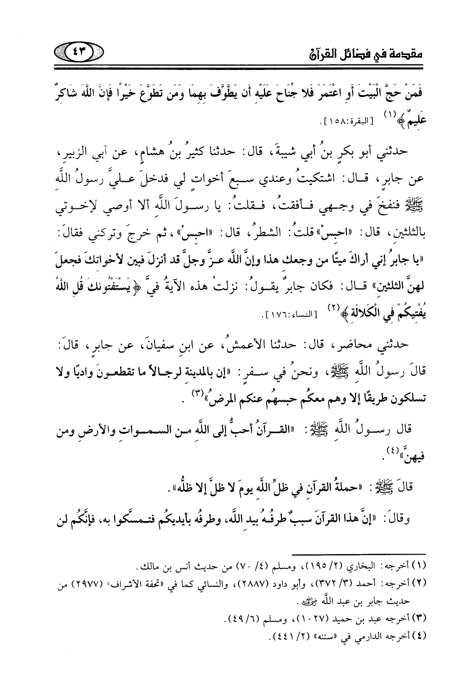 وقالَ: "إنَّ هذا القرآنَ سببٌ طرفُهُ بيدِ اللَّه، وطرفُه بأيديكُم فتمسَّكوا به،