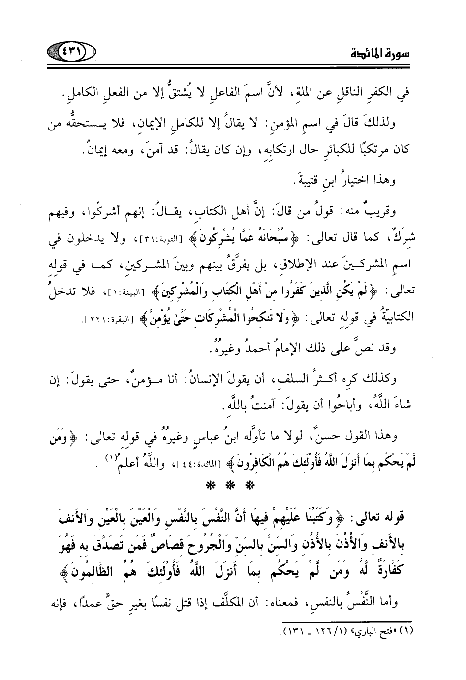 وكذلك كرِه أكثرُ السلفِ، أن يقولَ الإنسانُ: أنا مؤمنٌ، حتى يقولَ: إن