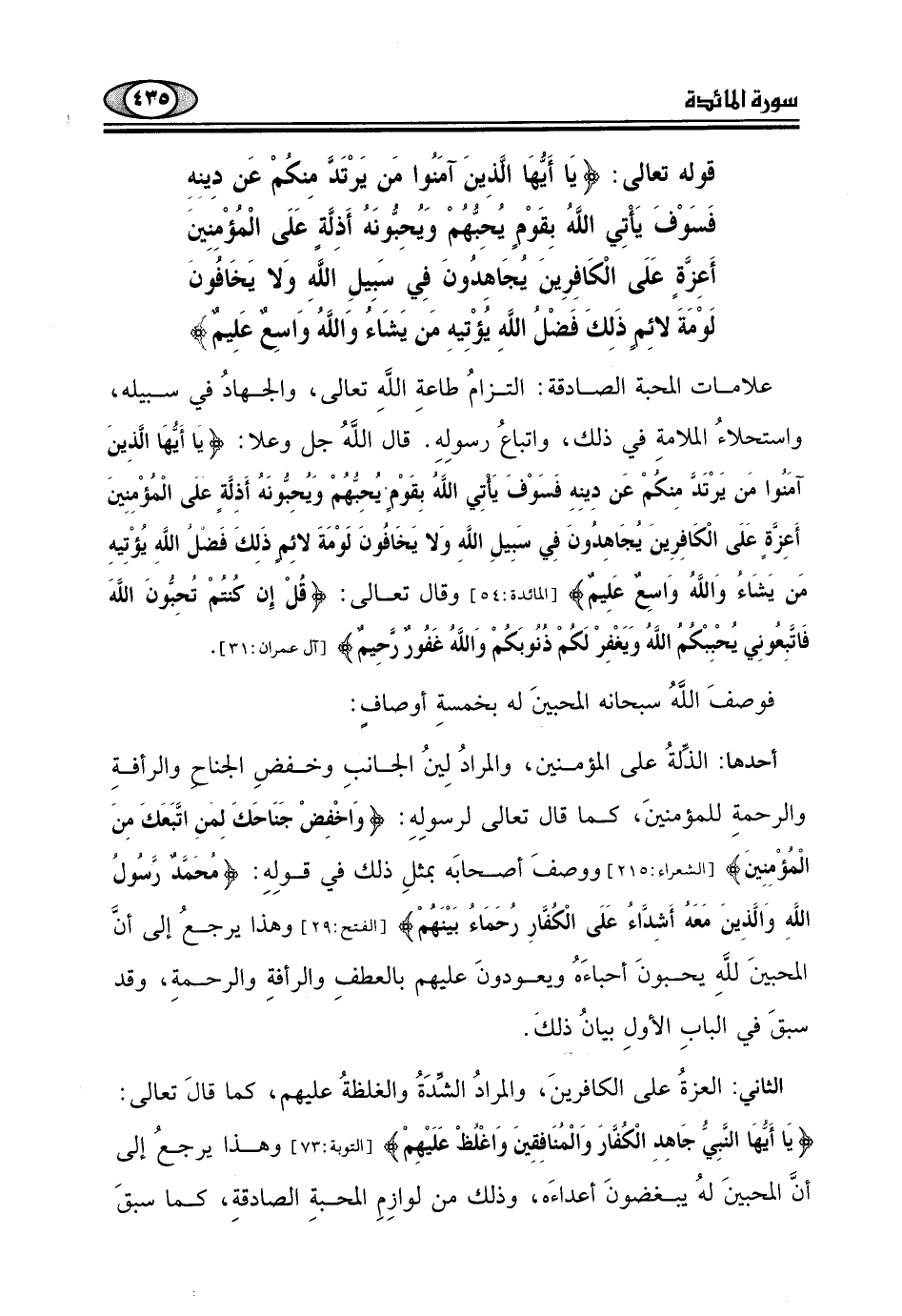 قال اللَّهُ جل وعلا: (يَا أَيُّهَا الَّذِينَ آمَنُوا مَنْ يَرْتَدَّ مِنْكُمْ عَنْ دِينِهِ فَسَوْفَ يَأْتِي اللَّهُ بِقَوْمٍ يُحِبُّهُمْ وَيُحِبُّونَهُ أَذِلَّةٍ عَلَى الْمُؤْمِنِينَ أَعِزَّةٍ عَلَى الْكَافِرِينَ يُجَاهِدُونَ فِي سَبِيلِ اللَّهِ وَلَا يَخَافُونَ لَوْمَةَ لَائِمٍ ذَلِكَ فَضْلُ اللَّهِ يُؤْتِيهِ مَنْ يَشَاءُ وَاللَّهُ وَاسِعٌ عَلِيمٌ (54) .