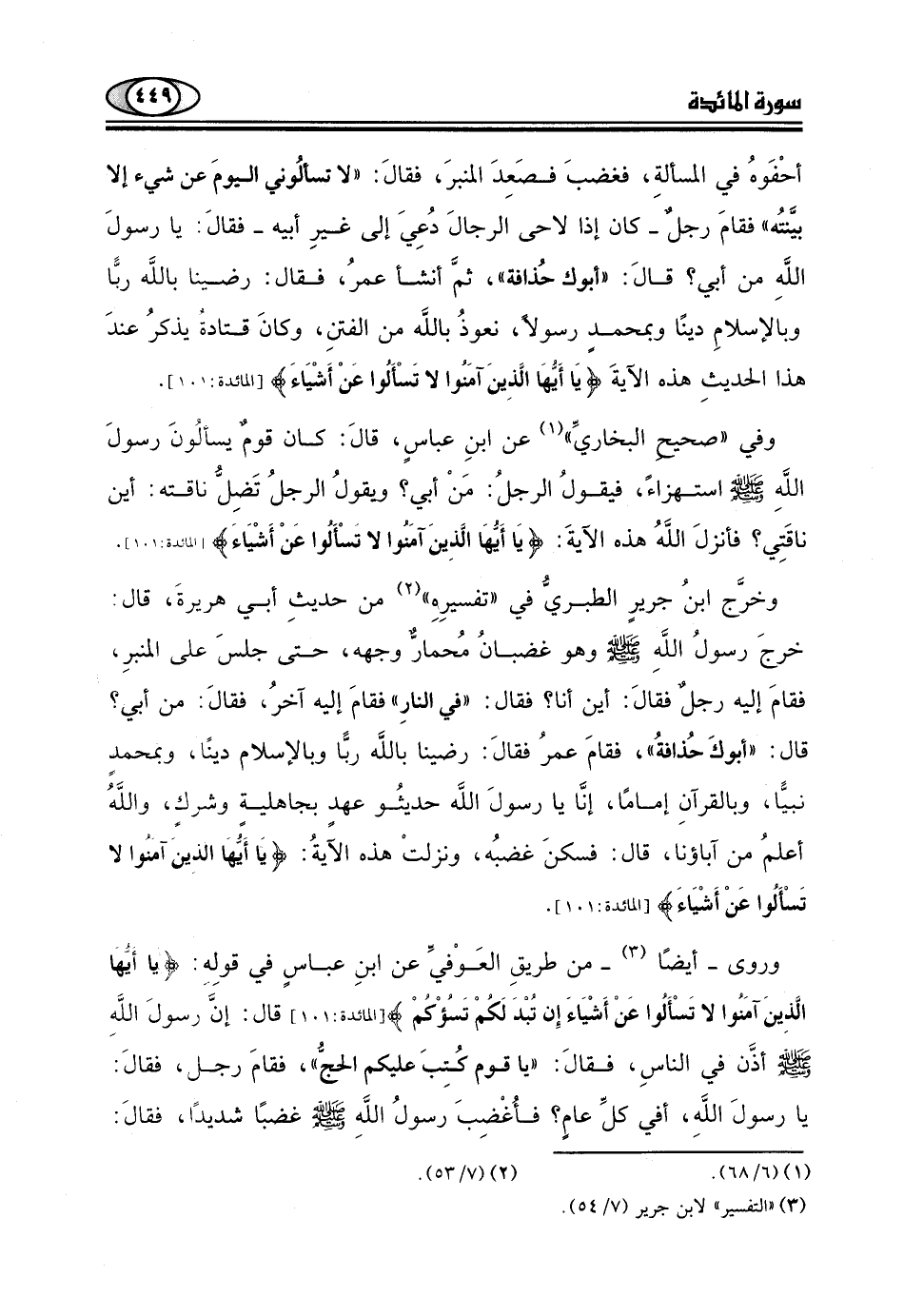 أحْفَوهُ في المسألةِ، فغضبَ فصَعِدَ المنبرَ، فقالَ: "لا تسألُوني اليومَ عن شيء إلا بينتُه" فقامَ رجل - كان إذا لاحى الرجالَ دُعِيَ إلى غيرِ أبيه - فقالَ: يا رسولَ اللَّهِ من أبي؛ قالَ: " أبوك حُذافة"، ثمَّ أنشأ عمرُ، فقال: رضينا باللَّه ربًّا وبالإسلامِ دينًا وبمحمدٍ رسولاً، نعوذُ باللَّه من الفتنِ، وكانَ قتادة يذكرُ عندَ هذا الحديثِ هذه الآيةَ (يَا أَيهَا الَّذِينَ آمَنوا لا تَسْاَلُوا عَنْ أَشْيَاءَ) .
