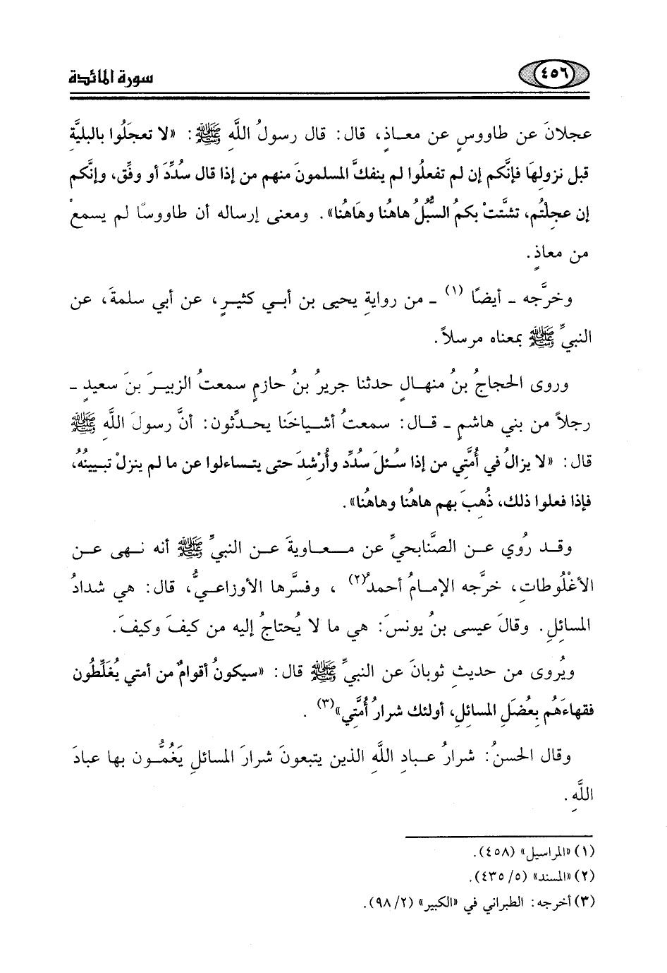 "لا تعجَلُوا بالبليَّةِ قبل نزولِهَا فإنَّكم إن لم تفعلُوا لم ينفكَّ المسلمونَ منهم من إذا قال سُدِّدَ أو وقق، وإنَّكم إن عجِلتُم، تشَّتتْ بكمُ السّبلُ هاهُنا وهَاهُنا". ومعنى إرساله أن طاووسًا لم يسمعْ من معاذ.