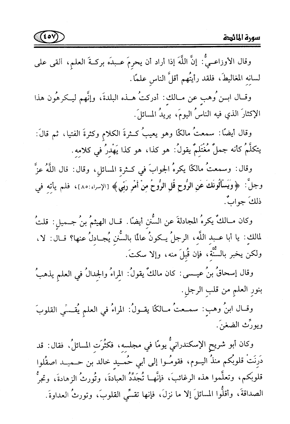 وقال: وسمعتُ مالكًا يكرهُ الجوابَ في كثرةِ المسائلِ، وقال: قال اللَّهُ عزَّ