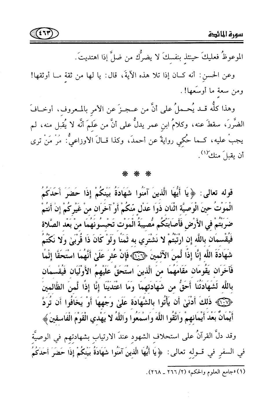 قوله تعالى: (يَا أَيُّهَا الَّذِينَ آمَنُوا شَهَادَةُ بَيْنِكُمْ إِذَا حَضَرَ أَحَدَكُمُ الْمَوْتُ حِينَ الْوَصِيَّةِ اثْنَانِ ذَوَا عَدْلٍ مِنْكُمْ أَوْ آخَرَانِ مِنْ غَيْرِكُمْ إِنْ أَنْتُمْ ضَرَبْتُمْ فِي الْأَرْضِ فَأَصَابَتْكُمْ مُصِيبَةُ الْمَوْتِ تَحْبِسُونَهُمَا مِنْ بَعْدِ الصَّلَاةِ فَيُقْسِمَانِ بِاللَّهِ إِنِ ارْتَبْتُمْ لَا نَشْتَرِي بِهِ ثَمَنًا وَلَوْ كَانَ ذَا قُرْبَى وَلَا نَكْتُمُ شَهَادَةَ اللَّهِ إِنَّا إِذًا لَمِنَ الْآثِمِينَ (106) فَإِنْ عُثِرَ عَلَى أَنَّهُمَا اسْتَحَقَّا إِثْمًا فَآخَرَانِ يَقُومَانِ مَقَامَهُمَا مِنَ الَّذِينَ اسْتَحَقَّ عَلَيْهِمُ الْأَوْلَيَانِ فَيُقْسِمَانِ بِاللَّهِ لَشَهَادَتُنَا أَحَقُّ مِنْ شَهَادَتِهِمَا وَمَا اعْتَدَيْنَا إِنَّا إِذًا لَمِنَ الظَّالِمِينَ (107) ذَلِكَ أَدْنَى أَنْ يَأْتُوا بِالشَّهَادَةِ عَلَى وَجْهِهَا أَوْ يَخَافُوا أَنْ تُرَدَّ أَيْمَانٌ بَعْدَ أَيْمَانِهِمْ وَاتَّقُوا اللَّهَ وَاسْمَعُوا وَاللَّهُ لَا يَهْدِي الْقَوْمَ الْفَاسِقِينَ (108)