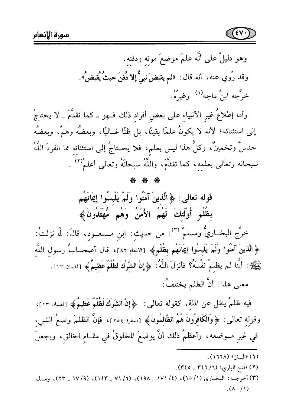 - صلى الله عليه وسلم -: أيُّنا لم يظلِمْ نفْسَهُ؟ فأنزلَ اللَّهُ: (إِنَّ الشِّرْكَ لَظُلْمٌ عَظِيمٌ) .