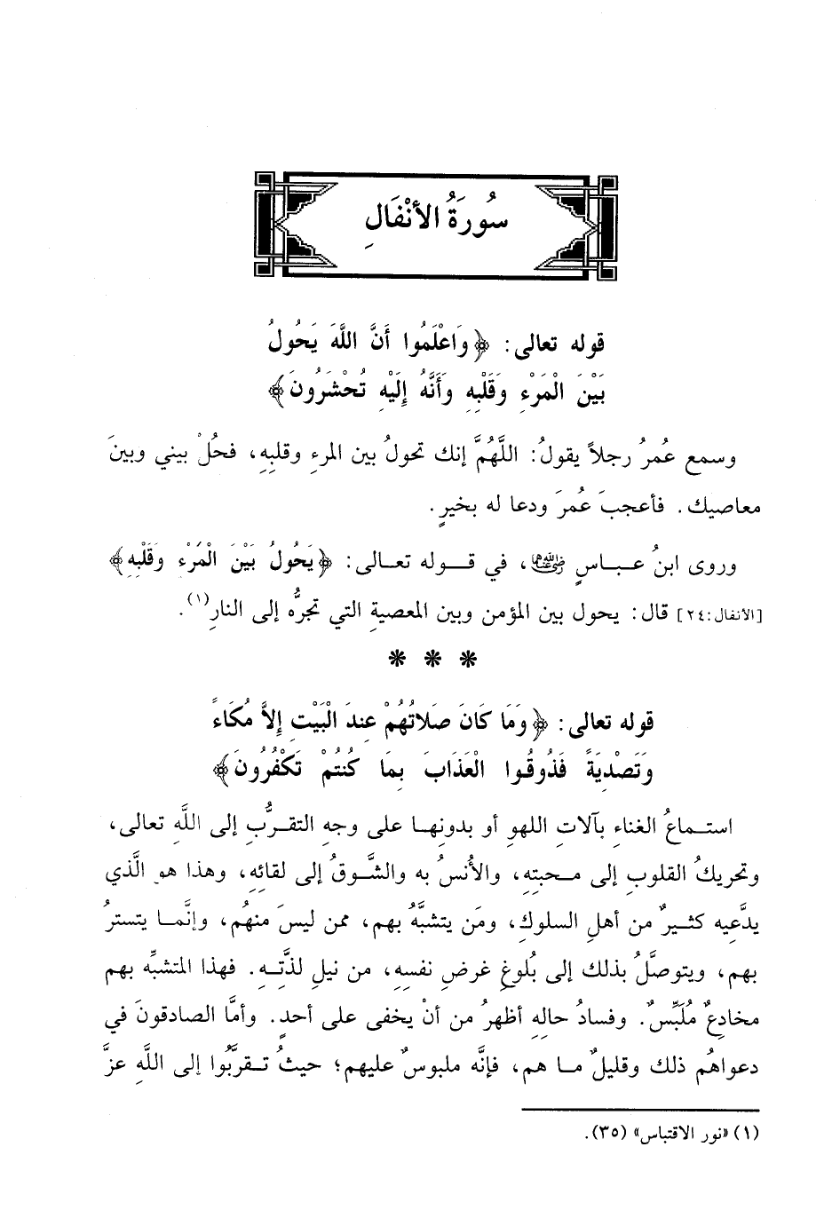 وروى ابنُ عباسٍ - رضي الله عنهما -، في قوله تعالى: (يَحُولُ بَيْنَ الْمَرْءِ وَقَلْبِهِ) ، قال: يحول بين المؤمن وبين المعصيةِ التي تجرُّهُ إلى النارِ.
