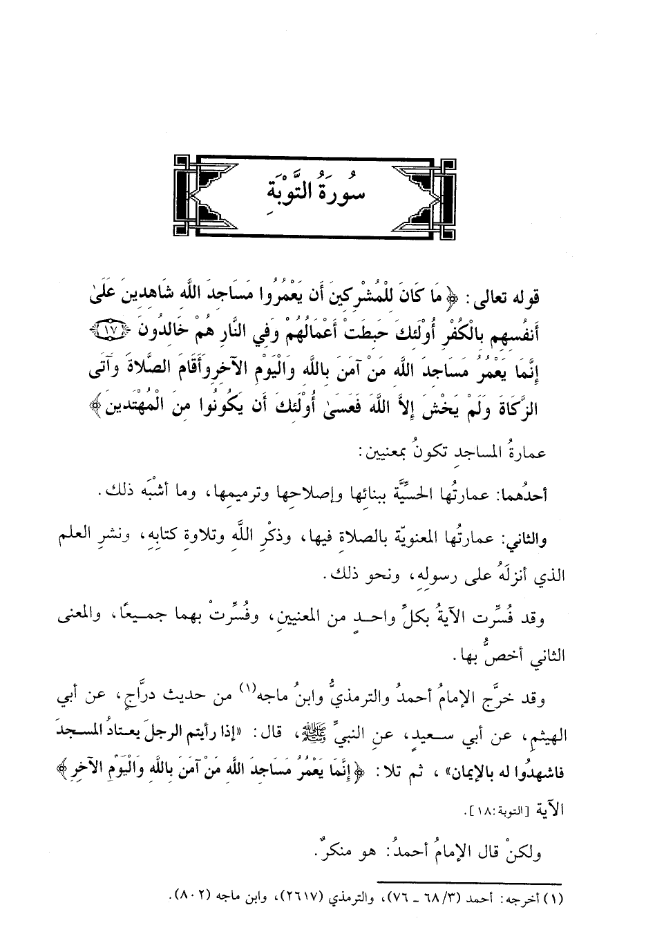 قوله تعالى: (مَا كَانَ لِلْمُشْرِكِينَ أَنْ يَعْمُرُوا مَسَاجِدَ اللَّهِ شَاهِدِينَ عَلَى أَنْفُسِهِمْ بِالْكُفْرِ أُولَئِكَ حَبِطَتْ أَعْمَالُهُمْ وَفِي النَّارِ هُمْ خَالِدُونَ (17) إِنَّمَا يَعْمُرُ مَسَاجِدَ اللَّهِ مَنْ آمَنَ بِاللَّهِ وَالْيَوْمِ الْآخِرِ وَأَقَامَ الصَّلَاةَ وَآتَى الزَّكَاةَ وَلَمْ يَخْشَ إِلَّا اللَّهَ فَعَسَى أُولَئِكَ أَنْ يَكُونُوا مِنَ الْمُهْتَدِينَ (18)