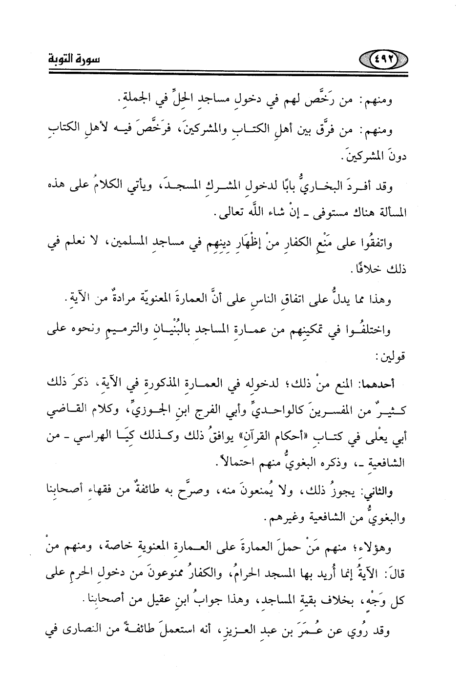 قالَ: الآية ُ إنما أُريد بها المسجد الحرامُ، والكفارُ ممنوعونَ من دخولِ الحرمِ على كل وَجْهٍ، بخلاف بقيةِ المساجدِ، وهذا جوابُ ابنِ عقيل من أصحابِنا.