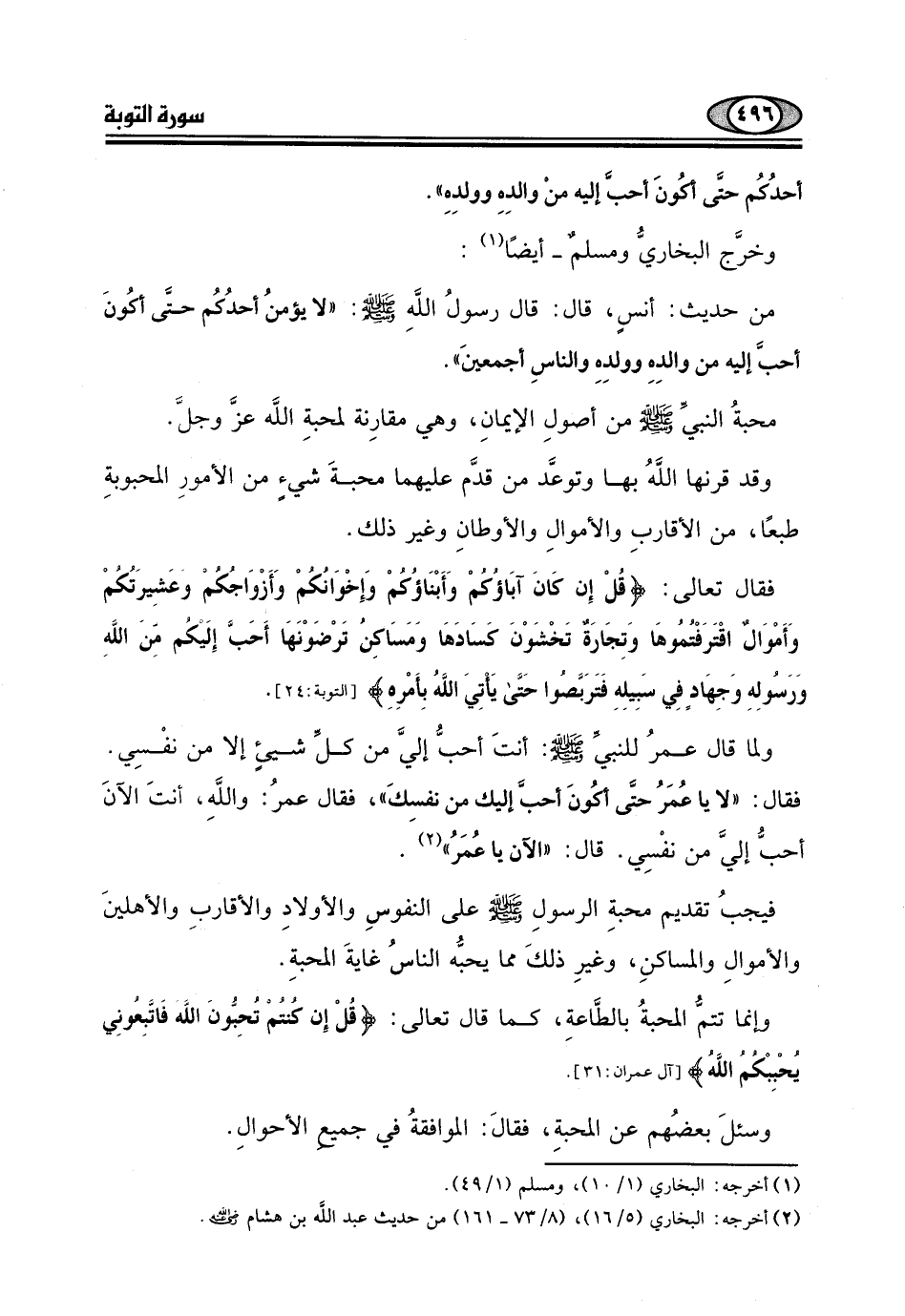 فقال تعالى: (قُلْ إِنْ كَانَ آبَاؤُكُمْ وَأَبْنَاؤُكُمْ وَإِخْوَانُكُمْ وَأَزْوَاجُكُمْ وَعَشِيرَتُكُمْ وَأَمْوَالٌ اقْتَرَفْتُمُوهَا وَتِجَارَةٌ تَخْشَوْنَ كَسَادَهَا وَمَسَاكِنُ تَرْضَوْنَهَا أَحَبَّ إِلَيْكُمْ مِنَ اللَّهِ وَرَسُولِهِ وَجِهَادٍ فِي سَبِيلِهِ فَتَرَبَّصُوا حَتَّى يَأْتِيَ اللَّهُ بِأَمْرِهِ) .